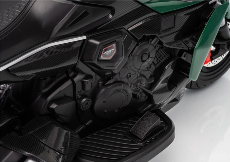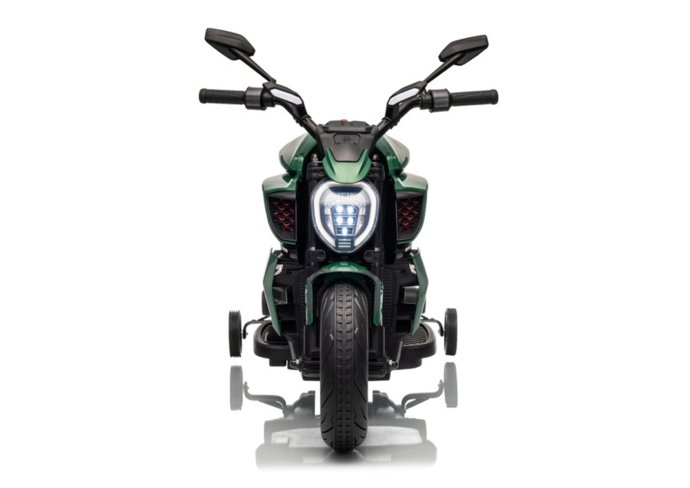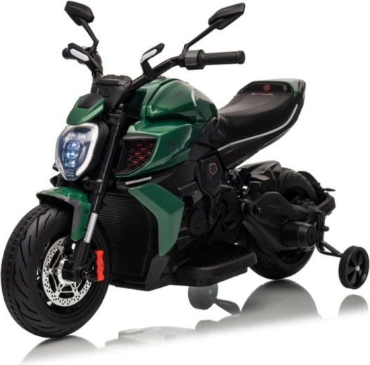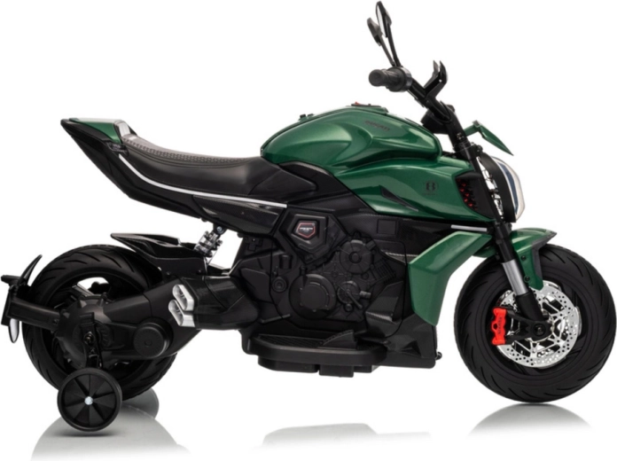 La moto électrique pour enfants en vert séduit par son look sportif et sa construction sûre. Grâce aux pneus larges et aux roulettes latérales de stabilisation, les enfants gagnent rapidement en confiance, tandis que le phare LED lumineux et les détails réalistes (rétroviseurs, freins à disque d’aspect réaliste) renforcent la véritable sensation de conduite.