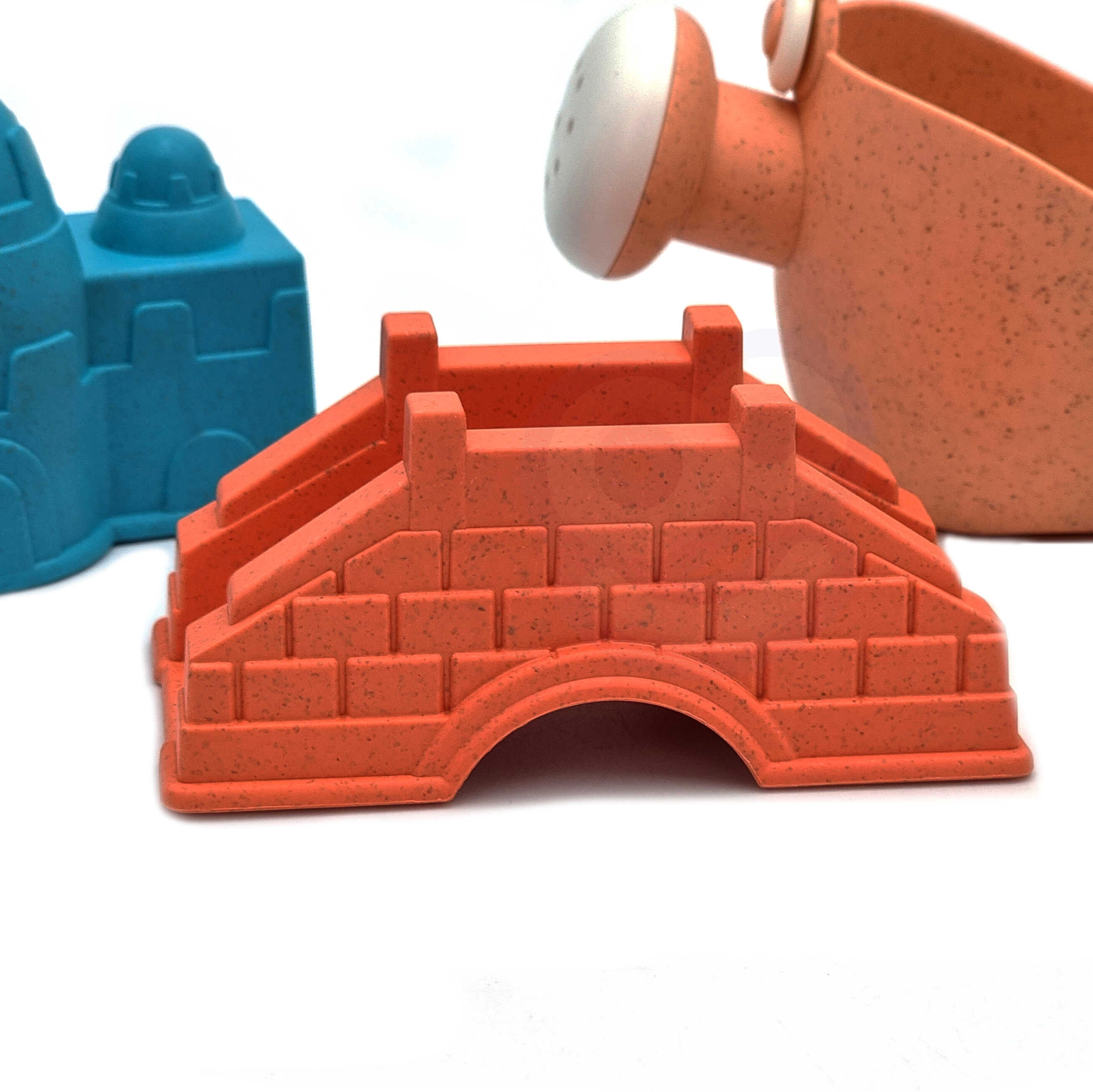 Des moules aux motifs de remparts et de pont aident les enfants à créer des constructions en sable solides et détaillées – parfait pour le bac à sable comme pour la plage.