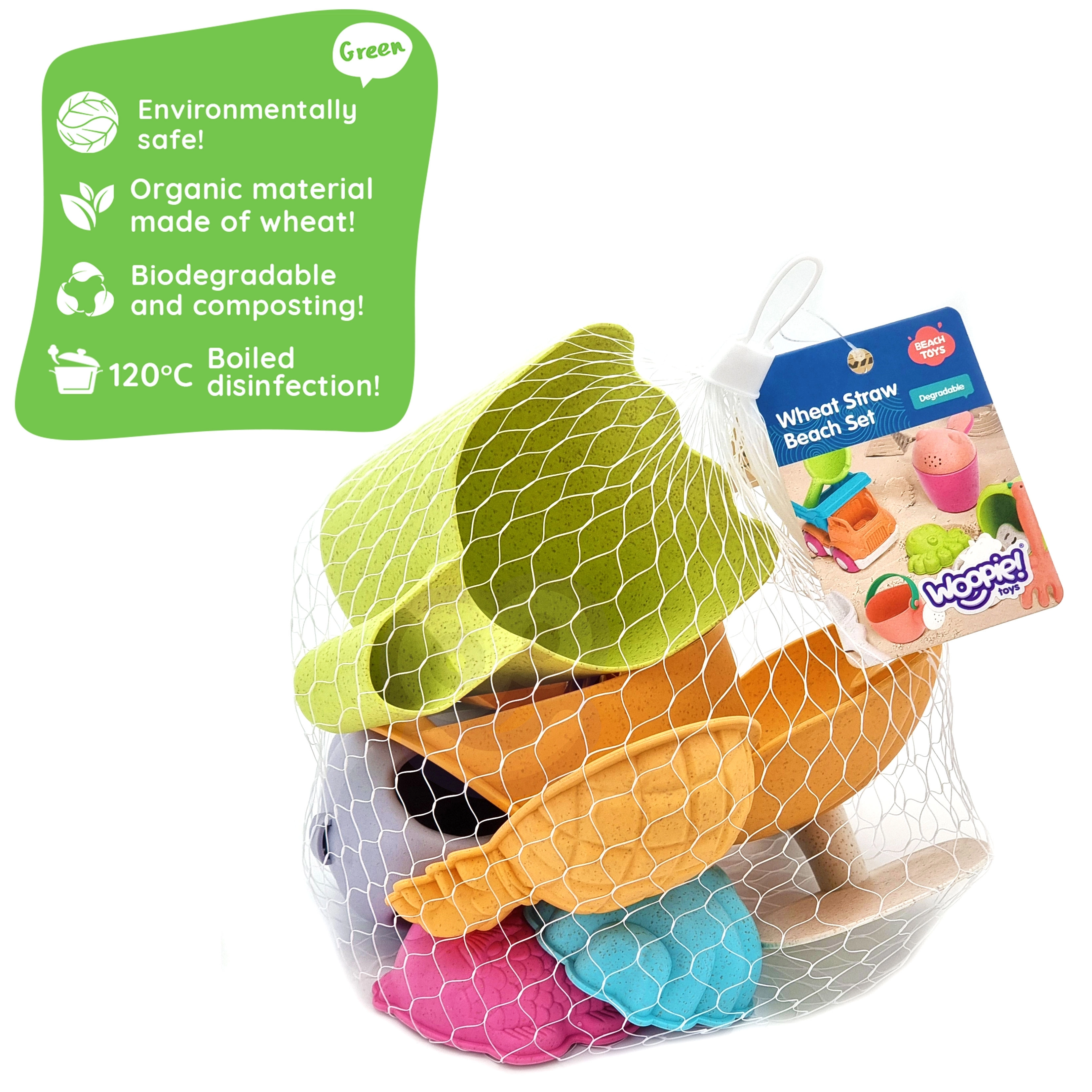 Ensemble de plage écologique WOOPIE GREEN qui ravira les enfants dès 3 ans ainsi que les parents soucieux de la nature. Il contient 7 éléments pratiques au design pastel : griffes pour le sable, grande cuillère, arrosoir, 3 moules, pelle et râteau. Fabriqué en matériau organique biodégradable, adapté au compostage et sans danger pour les enfants (désinfecté à 120 °C) – idéal pour le bac à sable, la plage et le jardin.