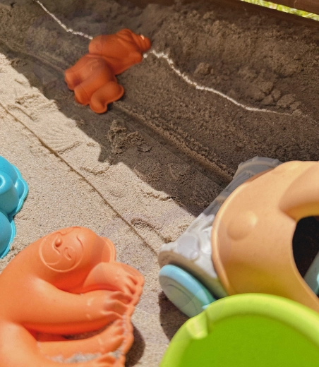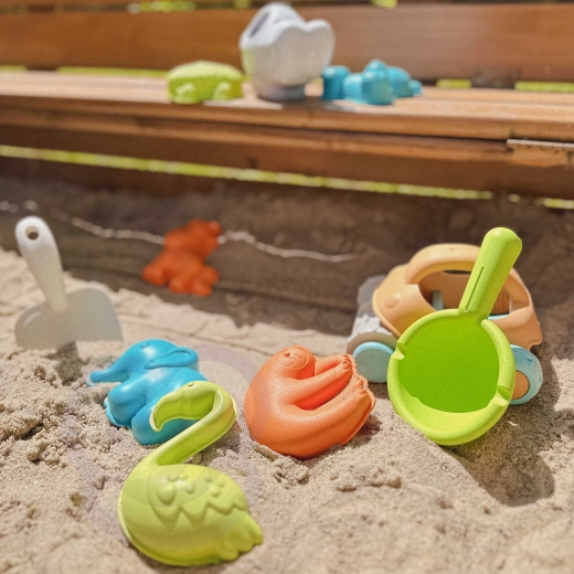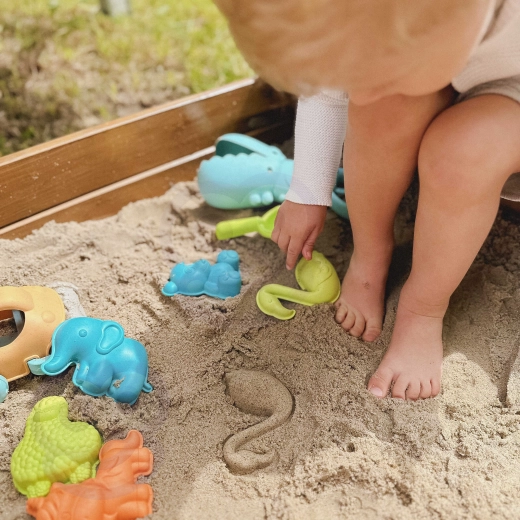 Des moules animaux variés, des pelles et un tamis stimulent l’imagination et développent la motricité fine lors de la construction, du transvasement et du modelage du sable.