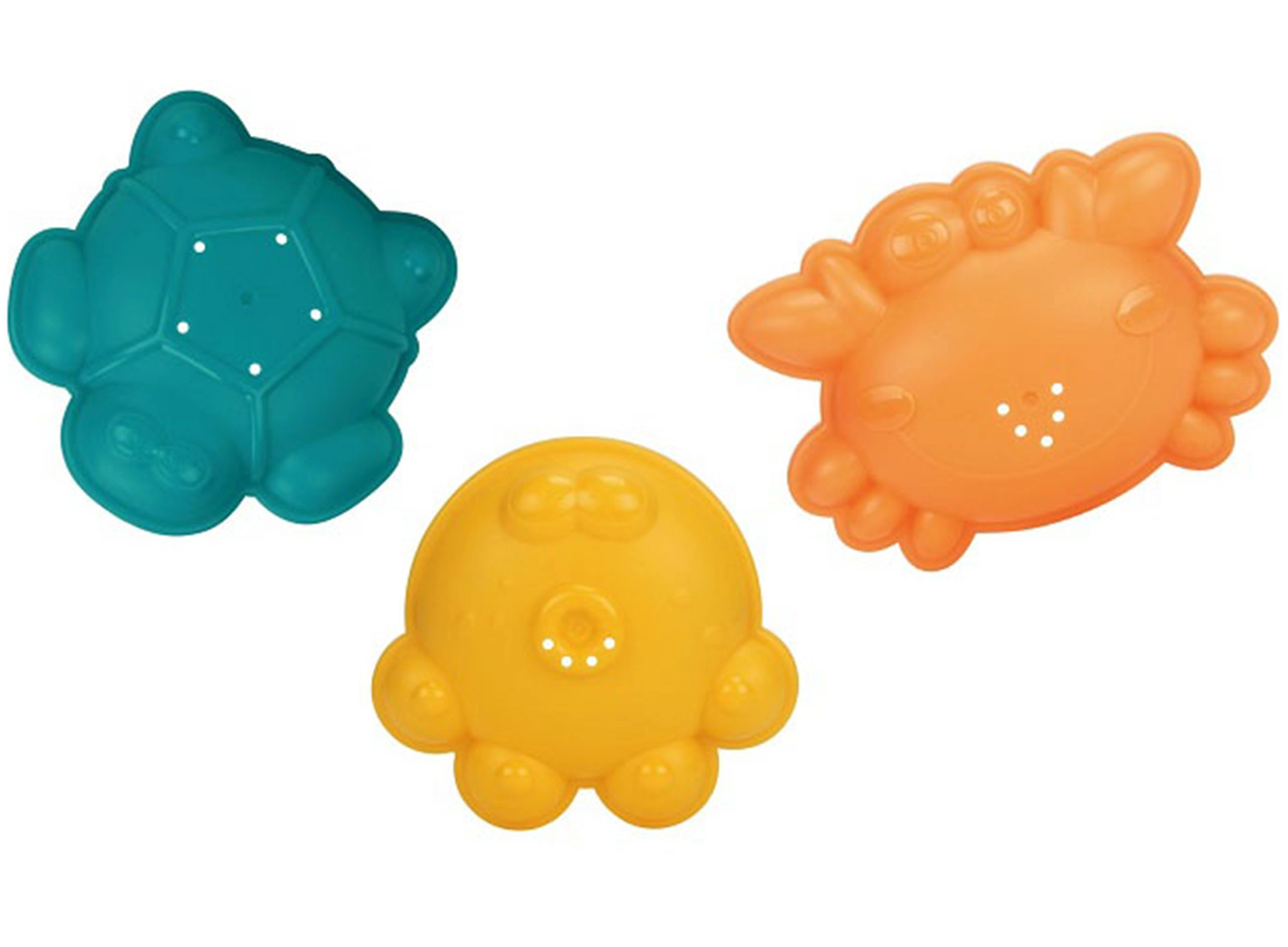 Trois moules colorés stimulent l’imagination et la création dans le sable comme dans l’eau. Les enfants peuvent facilement façonner une tortue, un crabe ou une pieuvre.