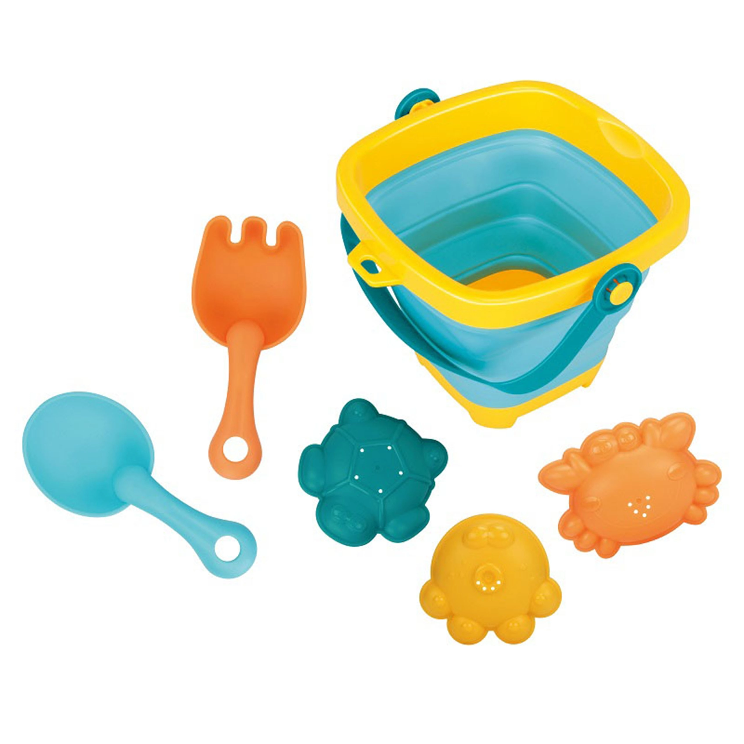 Set pratique pour le sable et la plage pour enfants dès 12 mois : seau en silicone pliable avec bord et anse en plastique, pelle, râteau et trois moules. Grâce au pliage accordéon, le seau économise de la place, est facile à transporter et idéal pour le sac à dos, la poussette ou le sac de plage. Les éléments résistants et flexibles sont parfaits pour le bac à sable, la plage et le jardin.