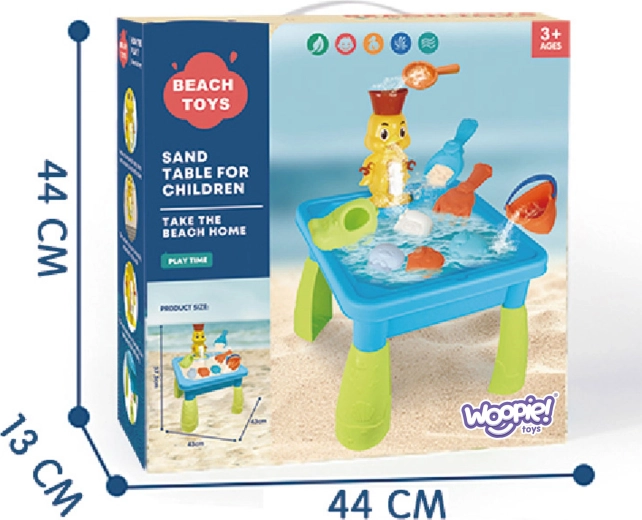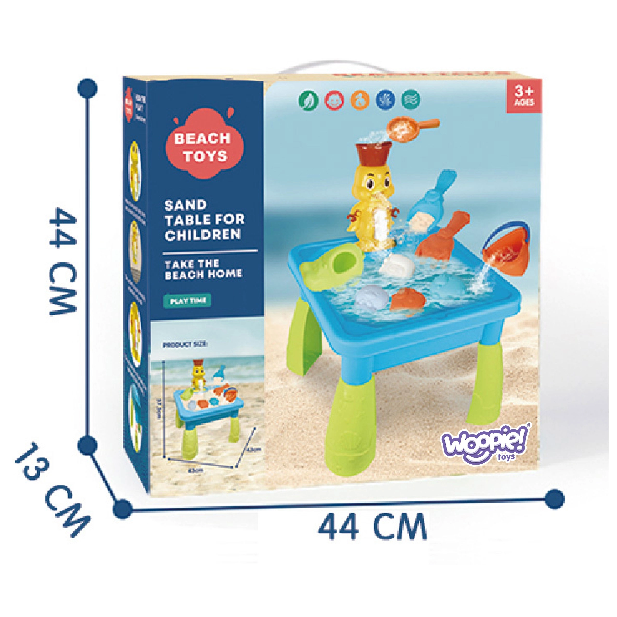 Table 2‑en‑1 amusante pour jouer avec l’eau et le sable de la marque WOOPIE, offrant des heures de jeu sensoriel. Comprend un petit canard avec moulin à eau et un effet cascade, pouvant être fixé dans la baignoire ou sur le mur grâce à des ventouses. L’ensemble inclut 9 à 10 accessoires, dont seau, pelles, râteau et moules. Idéal pour jouer à la maison comme en extérieur, pliage et montage faciles, recommandé dès 3 ans.