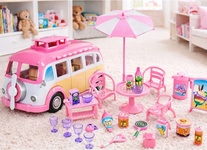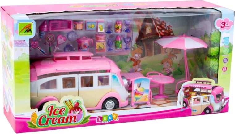 Le camping-car – glacerie est un set de jeu bien pensé qui combine véhicule, petit café et stand de sucreries. Une fois les portes ouvertes et le toit relevé, on obtient un intérieur facilement accessible avec comptoir, étagères et espace pour préparer et servir les gourmandises. Grâce aux couleurs vives et aux détails réalistes, les enfants inventent aisément leurs propres histoires.