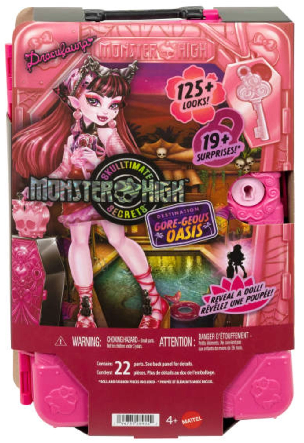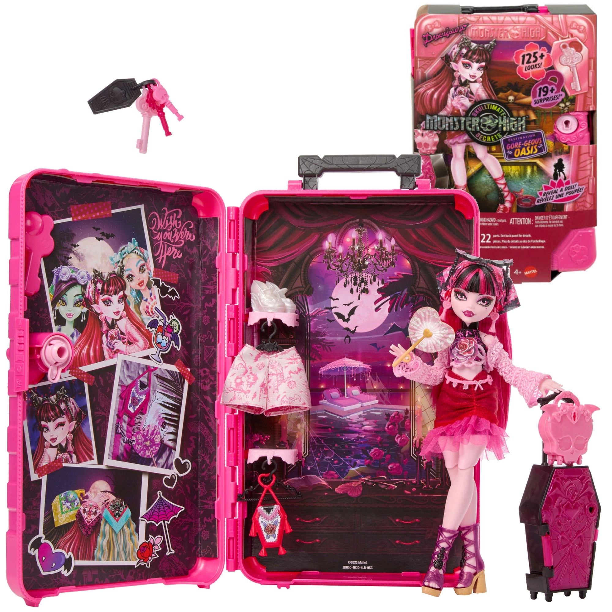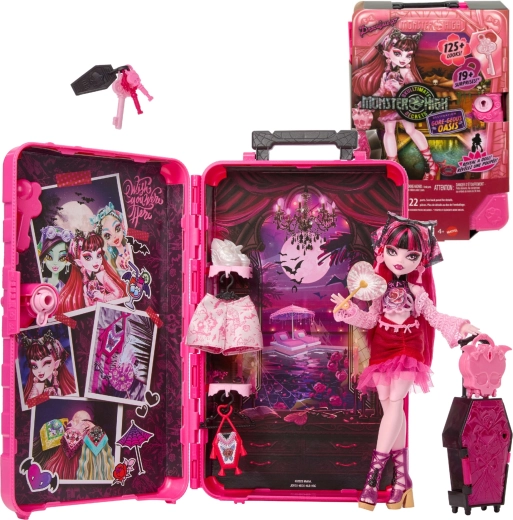 La poupée Draculaura de la série Monster High Secret Monsters invite les enfants dans un monde de mode vampirique et de voyage. La grande valise rose et noire à roulettes s’ouvre et révèle des porte‑manteaux, des étagères et de la place pour ranger tenues et accessoires. Cherchez les trois clés, déverrouillez les casiers et découvrez de nouvelles pièces – des lunettes et du bandana jusqu’à l’éventail et aux chaussures.