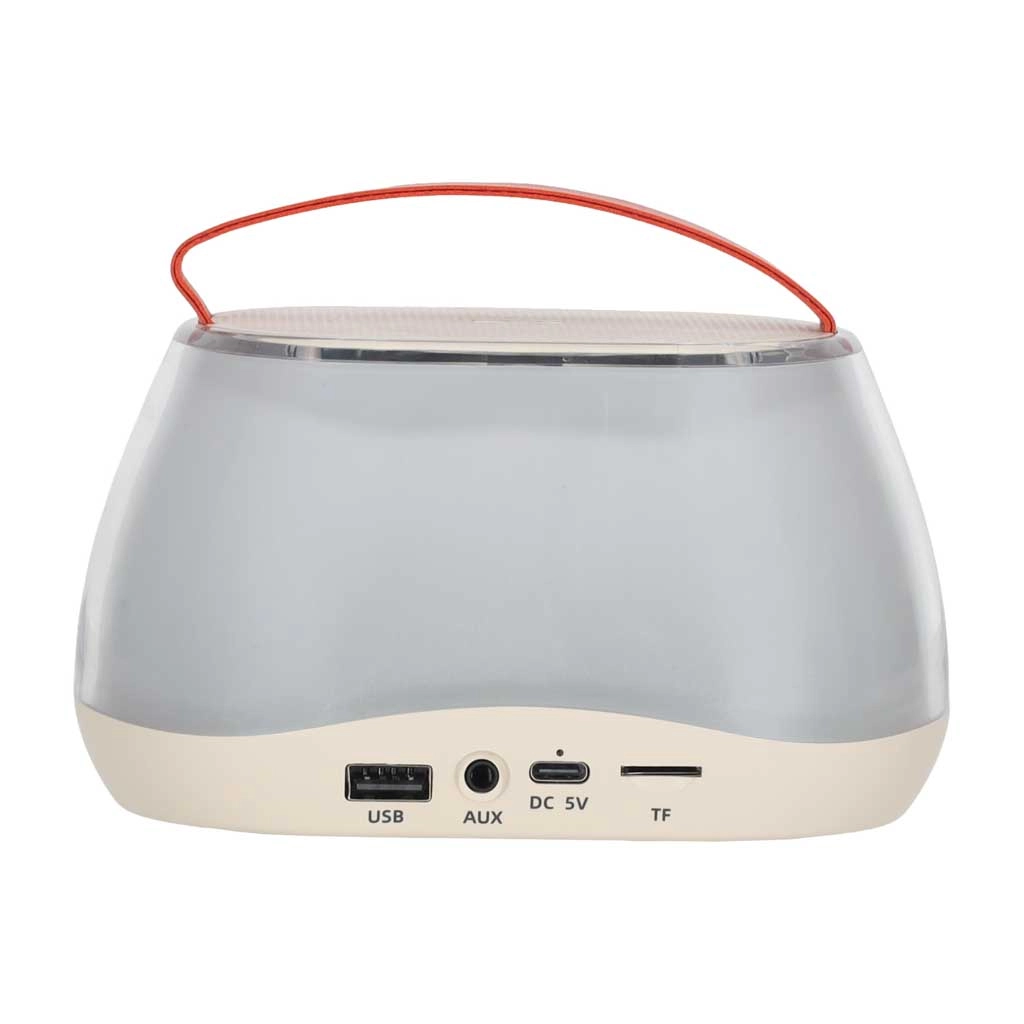 Bluetooth pour le streaming sans fil, USB et TF/microSD pour les fichiers depuis une clé, AUX pour les sources filaires. Recharge via DC 5 V/USB-C.