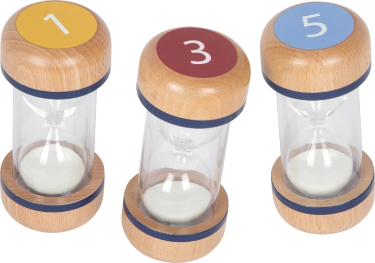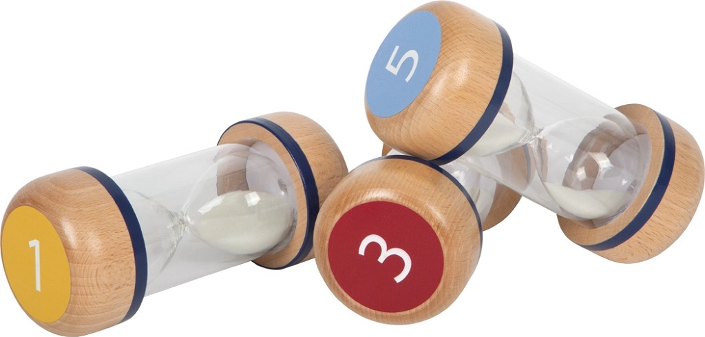 Des sabliers différenciés par couleur avec un marquage clair 1, 3 et 5 minutes facilitent l’orientation et la mise en place d’activités courtes.