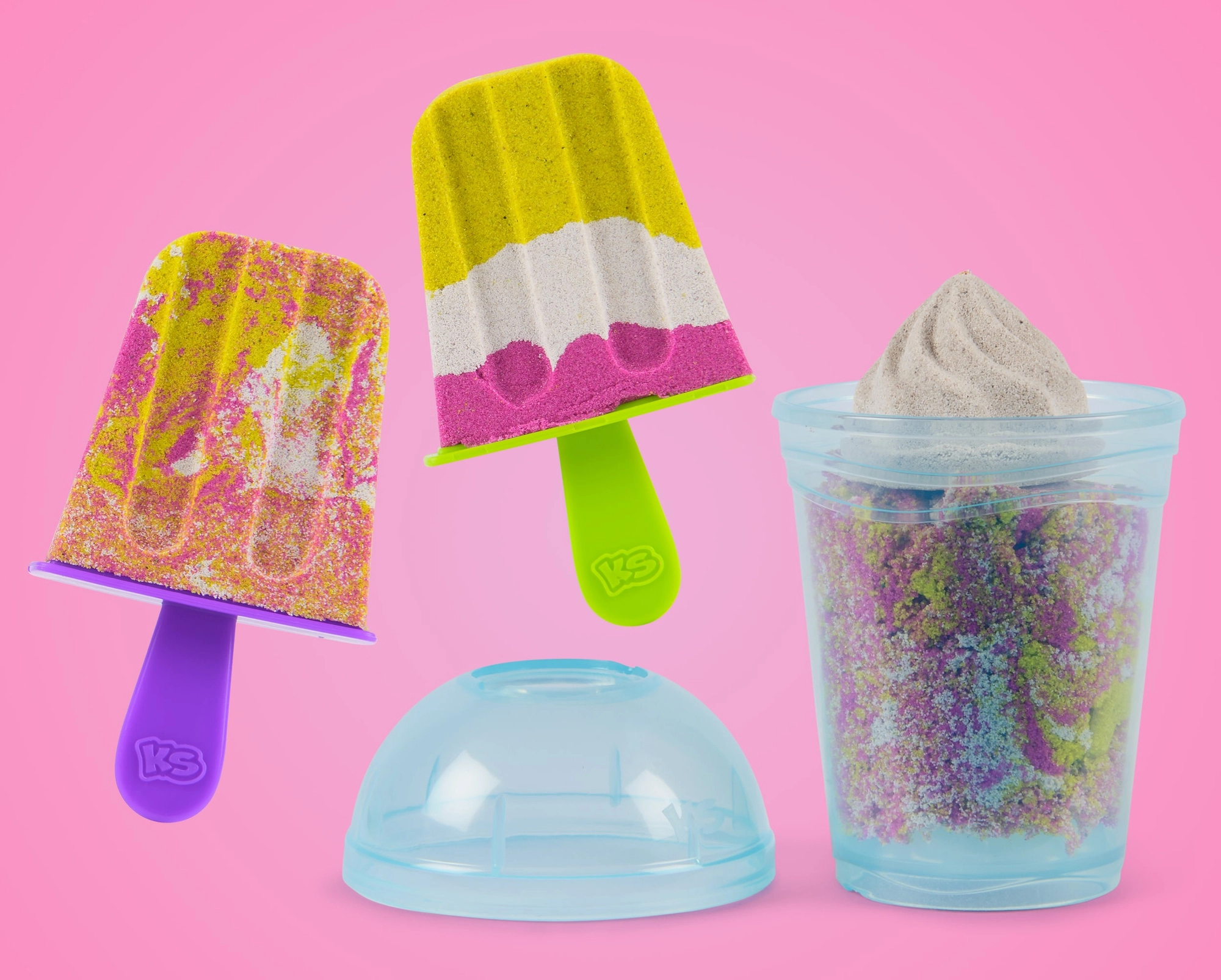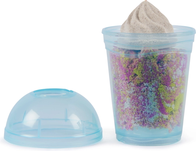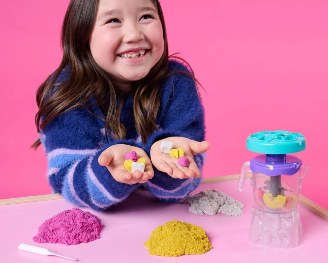 Avec le Kinetic Sand smoothie mixer, les enfants apprennent à mélanger les couleurs et à superposer des “boissons” et “desserts” dans des gobelets ou des moules à esquimaux. Il suffit de verser le sable dans le couvercle du mixeur, de tourner manuellement et d’observer la création de nouvelles nuances et de textures réalistes. Le sable cinétique semble humide, mais les mains restent sèches et la surface de travail plus propre.
