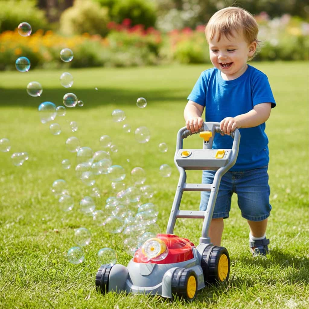 En poussant, la tondeuse émet automatiquement plein de petites bulles de savon, transformant une simple promenade en aventure ludique.