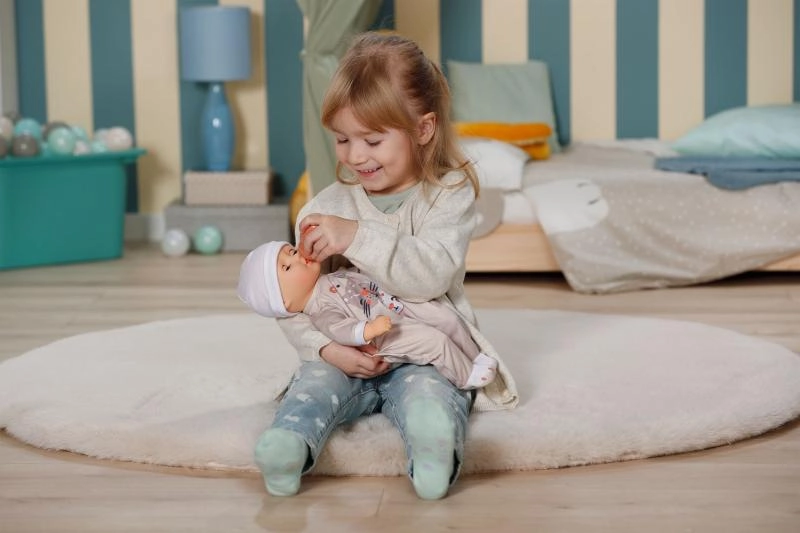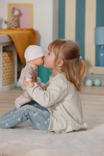Adorable poupée BABY born Anna en grenouillère beige, parfaite comme première amie pour les tout-petits. Elle possède un corps en tissu tout doux pour câliner, des yeux dormeurs et est livrée avec un biberon pour jouer à la tétée. Grâce à sa taille compacte de 36 cm, elle tient facilement dans les petites mains et convient aux enfants à partir de 1 an.