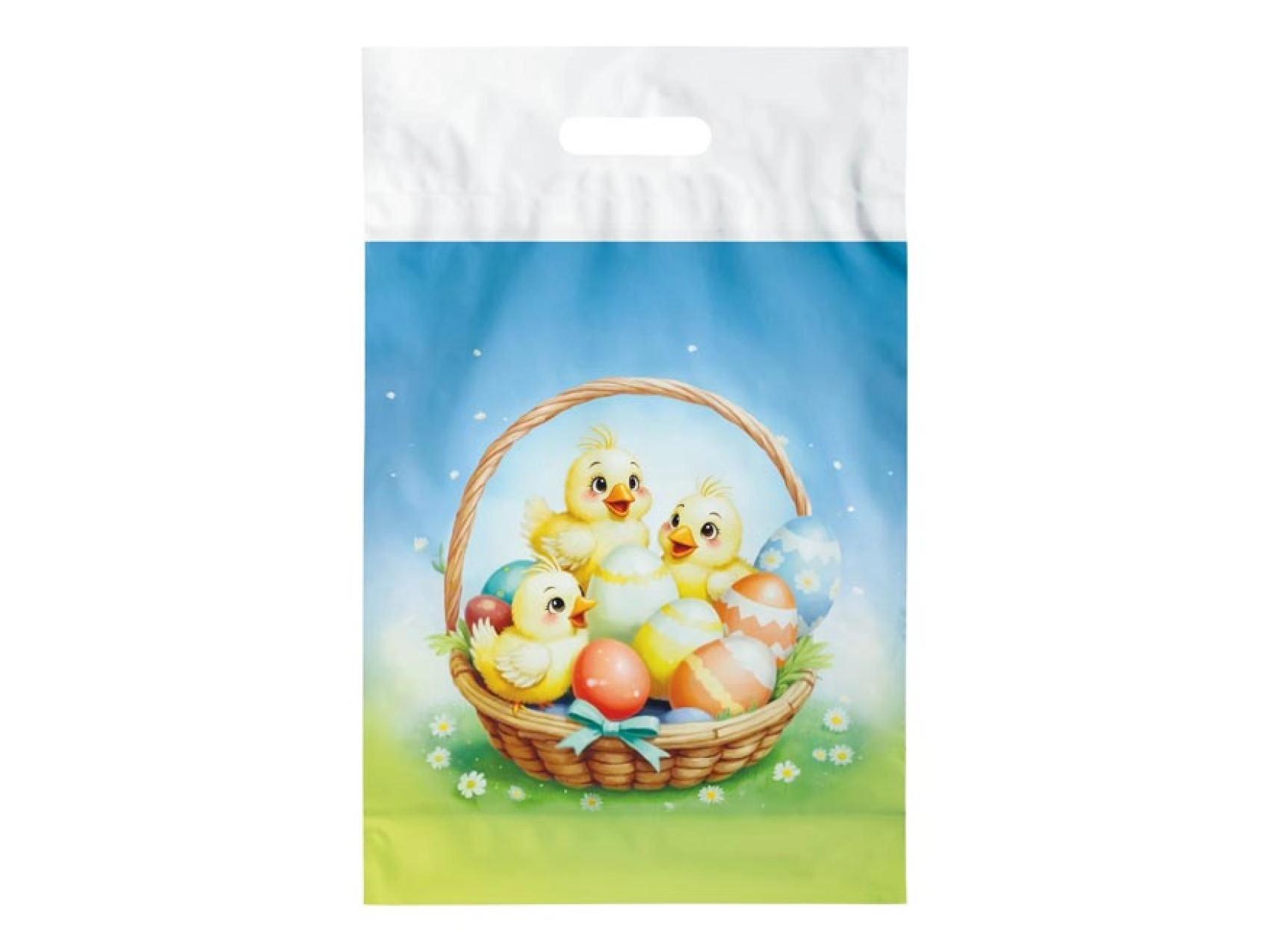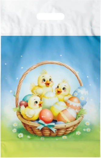 Pratique sac plastique de Pâques en taille L avec motif printanier, idéal pour emballer des cadeaux, friandises de Pâques et décorations. Grâce à sa anse en plastique, il se porte confortablement et son imprimé joyeux complète parfaitement toute surprise pascale. Fabriqué en matériau léger mais résistant adapté à un usage répété.