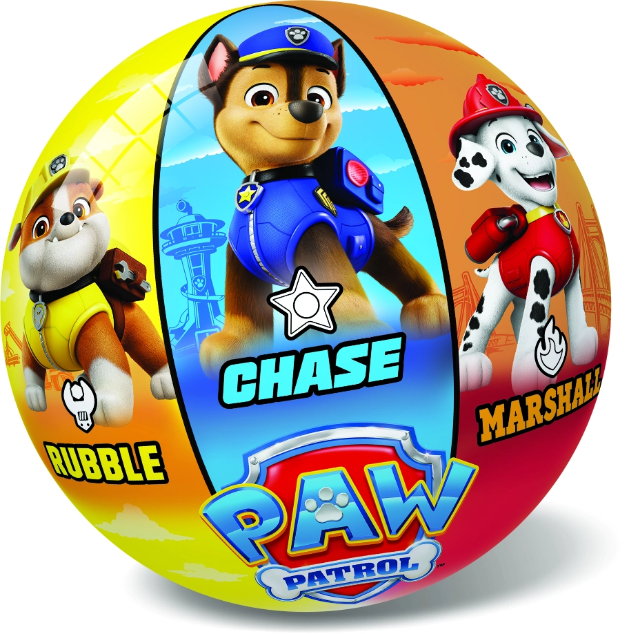 Ballon coloré pour enfants avec motifs PAW Patrol, idéal pour jouer à la maison et en plein air. Diamètre 23 cm, surface plastique lisse et impressions joyeuses des héros préférés comme Chase, Marshall, Skye, Zuma et Rocky. Parfait pour lancer, attraper et taper du pied.
