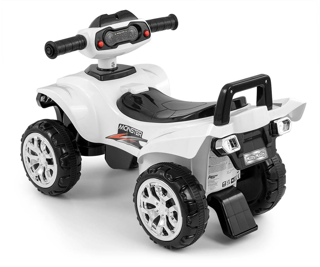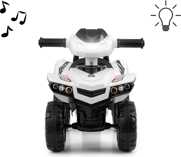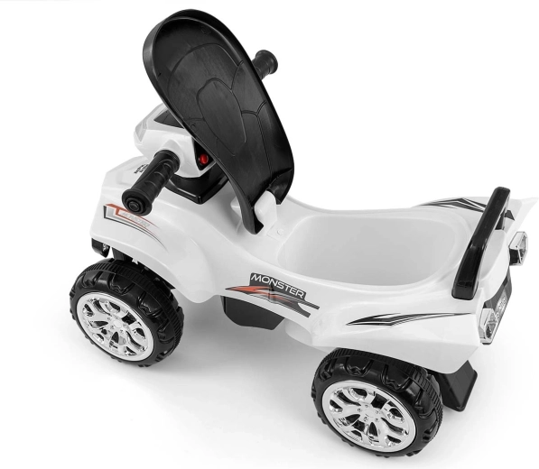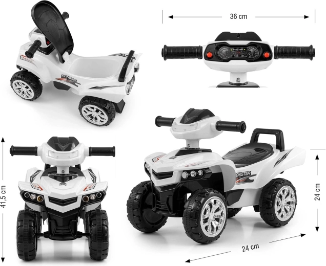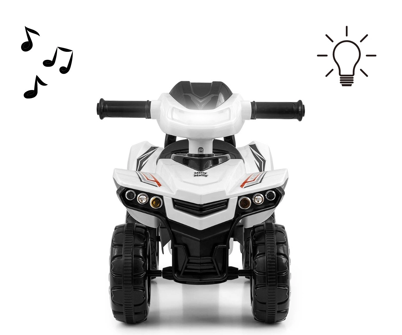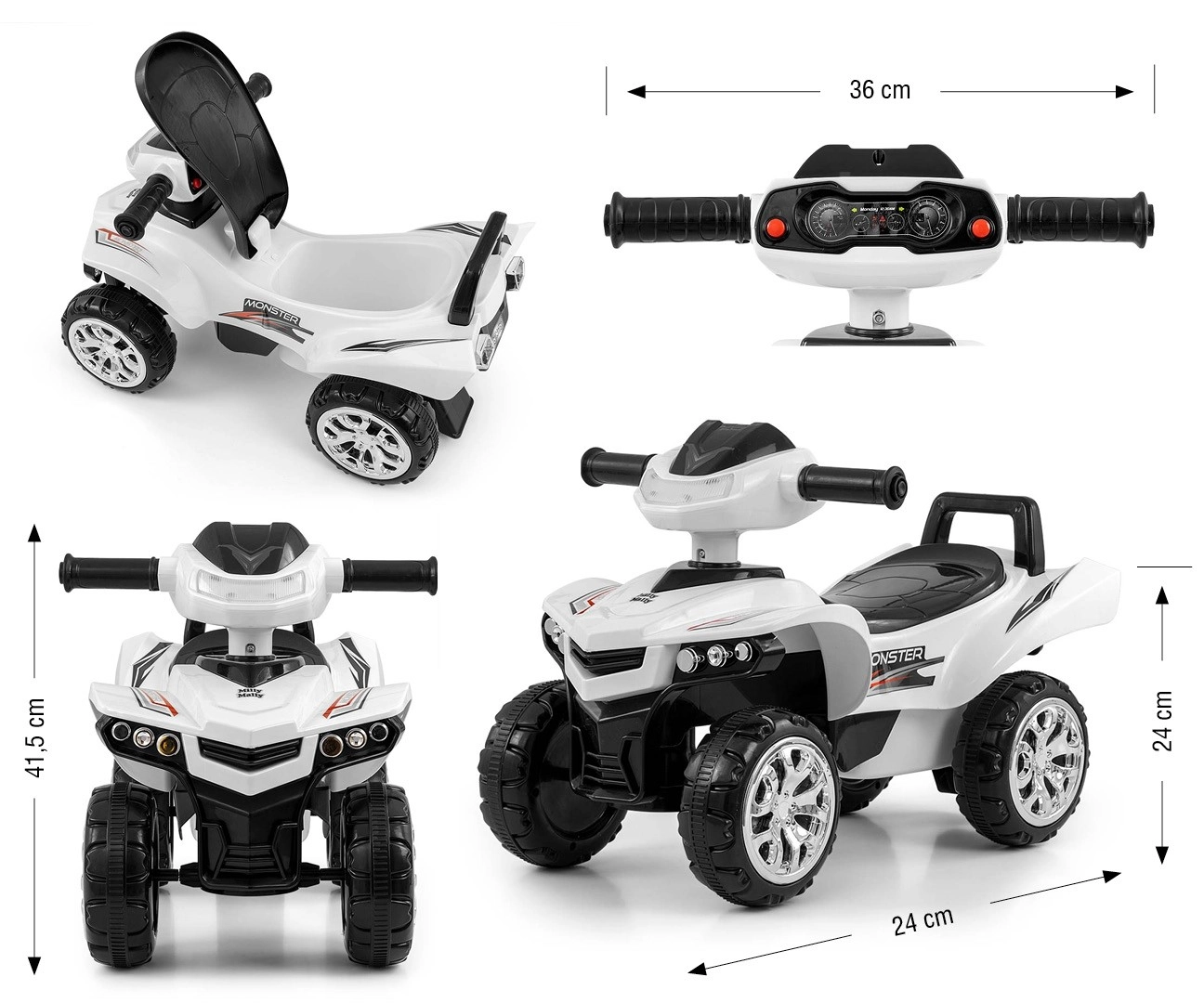 Draisienne pour enfants au style quad, pour jouer à la maison comme en plein air. Elle offre de larges roues à bande de roulement pour la stabilité, une selle profilée pour le confort et un volant interactif avec mélodies et lumières pour s’amuser tout en développant la motricité. Sous la selle, un pratique compartiment de rangement accueille les petits objets.