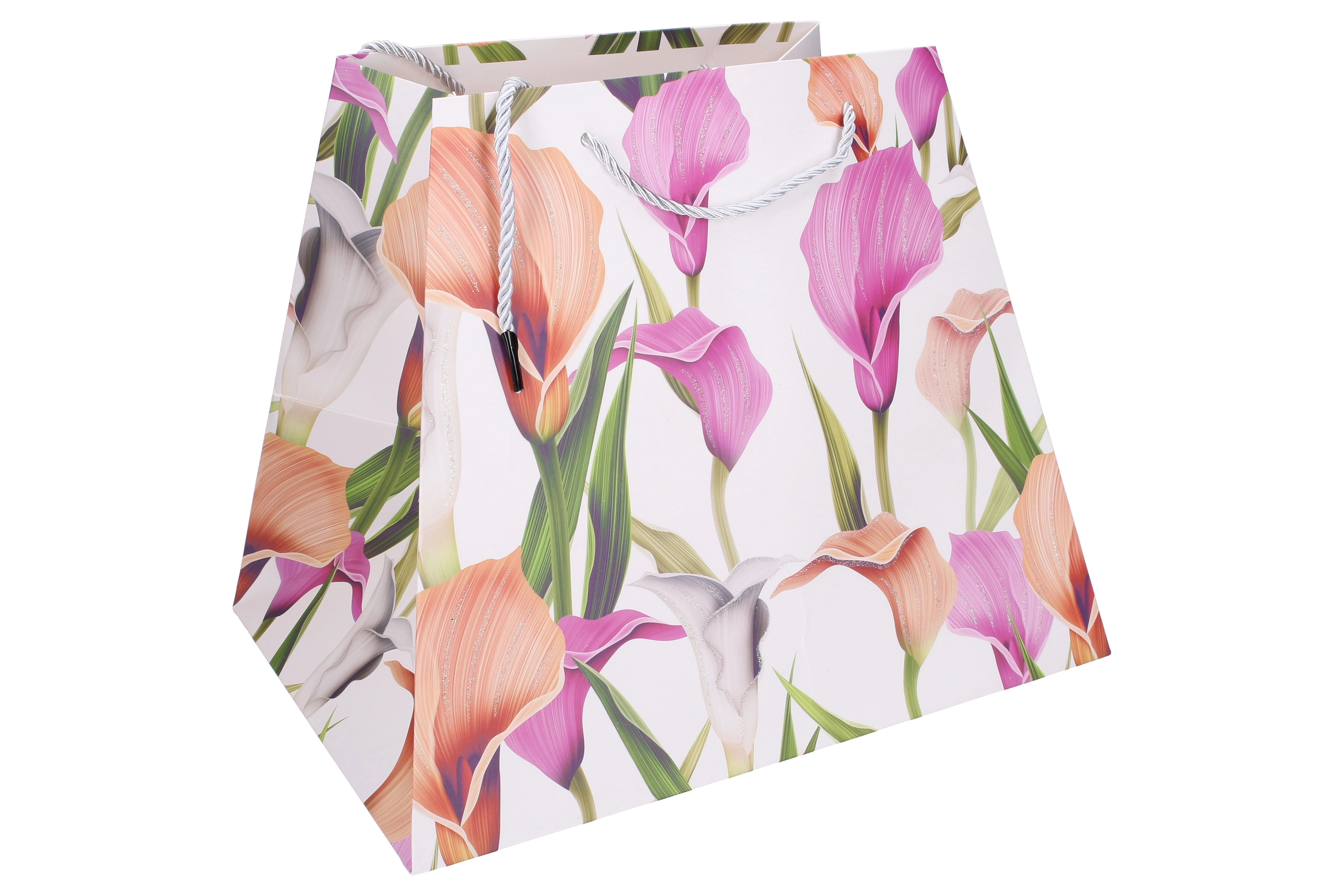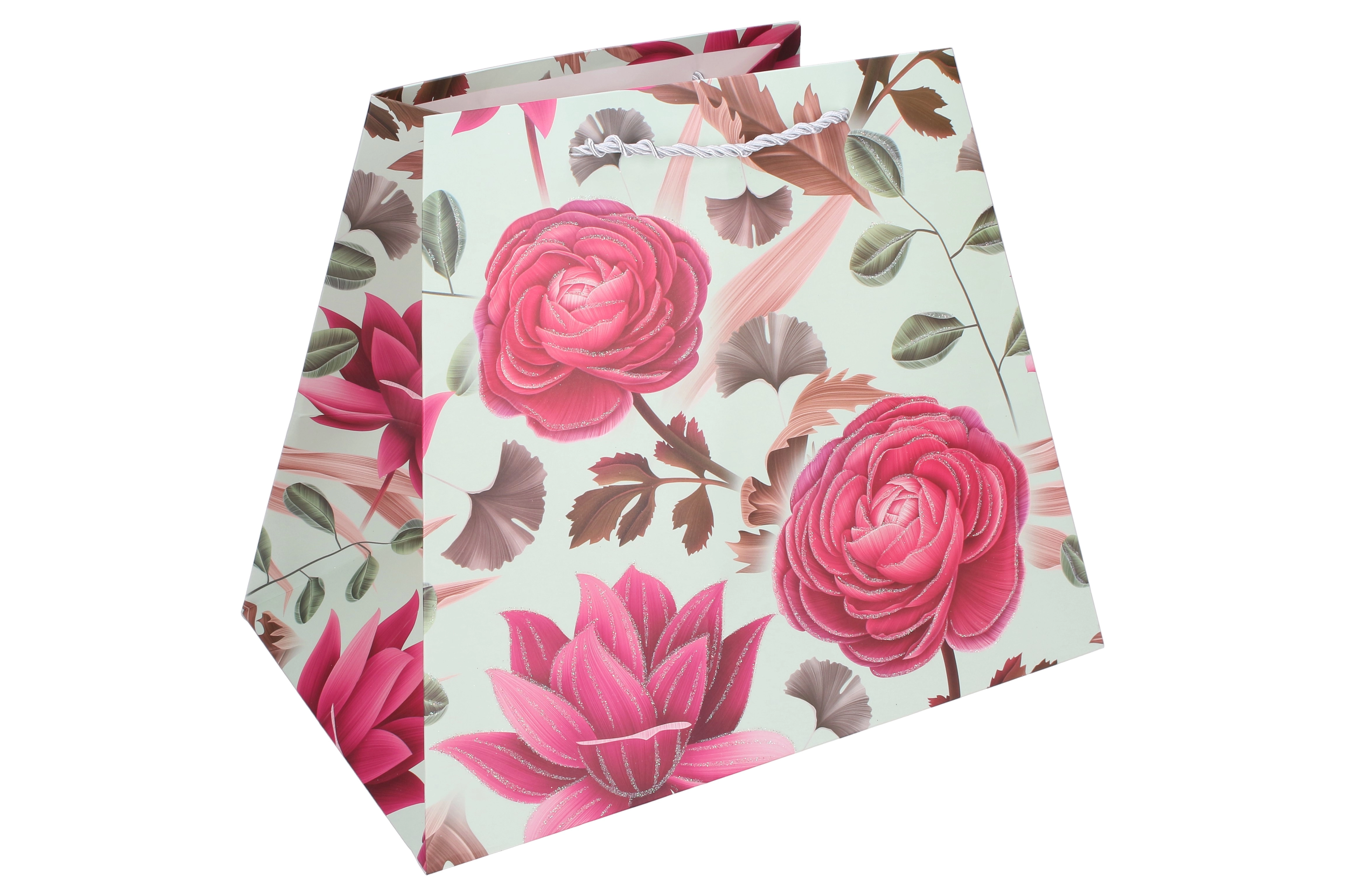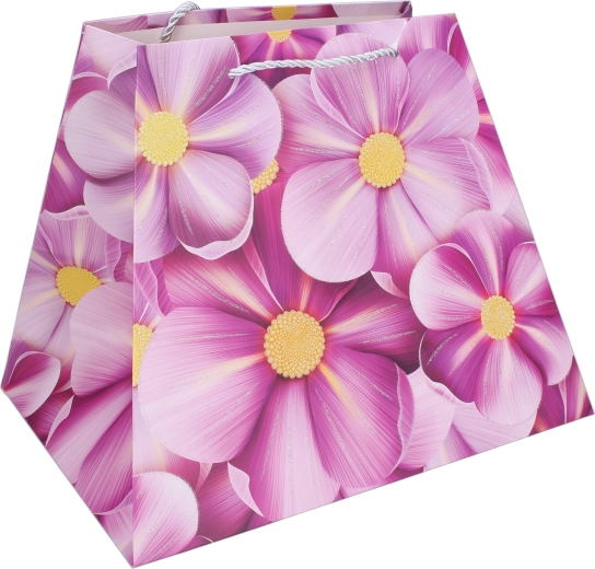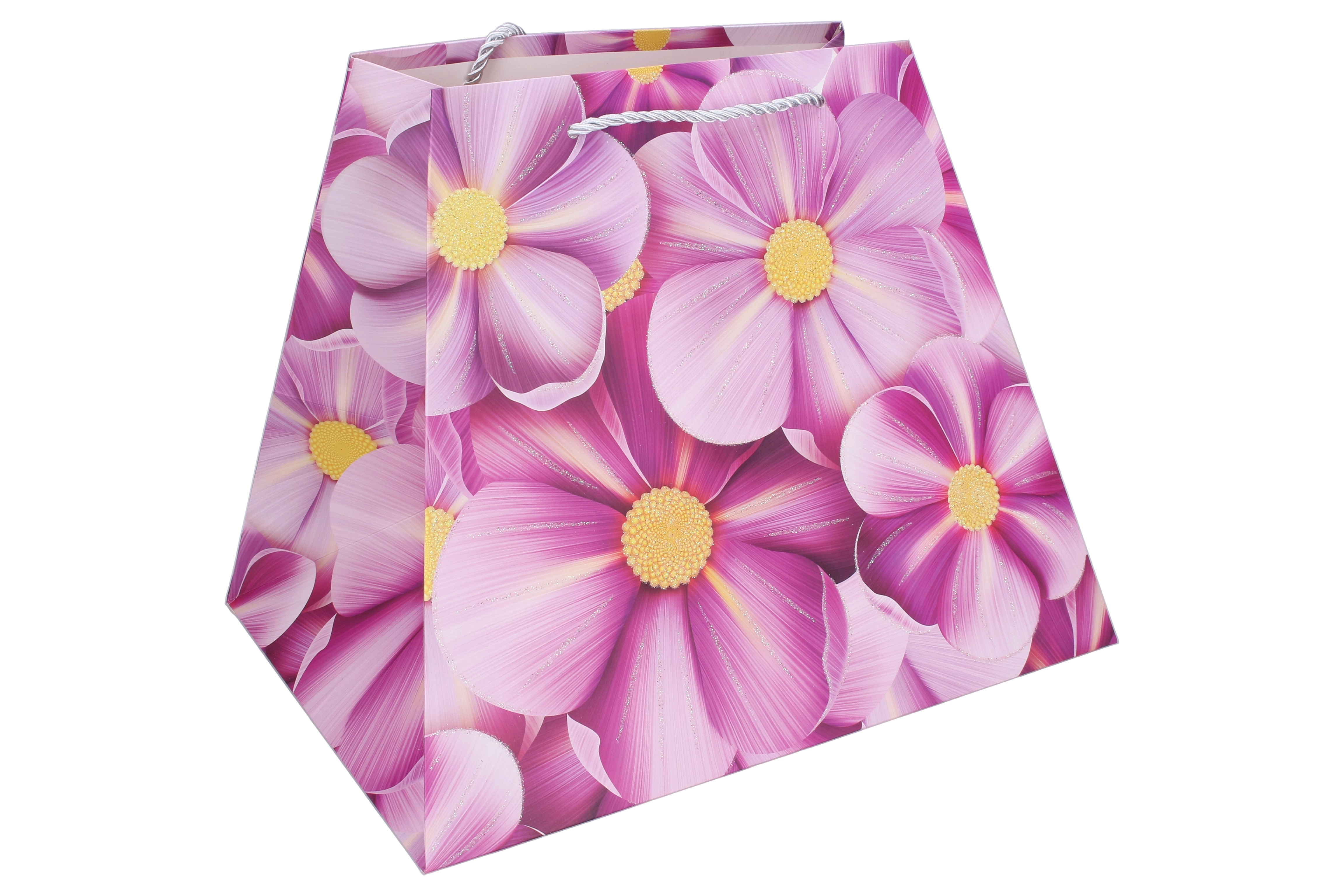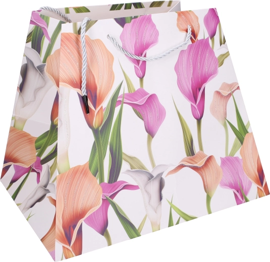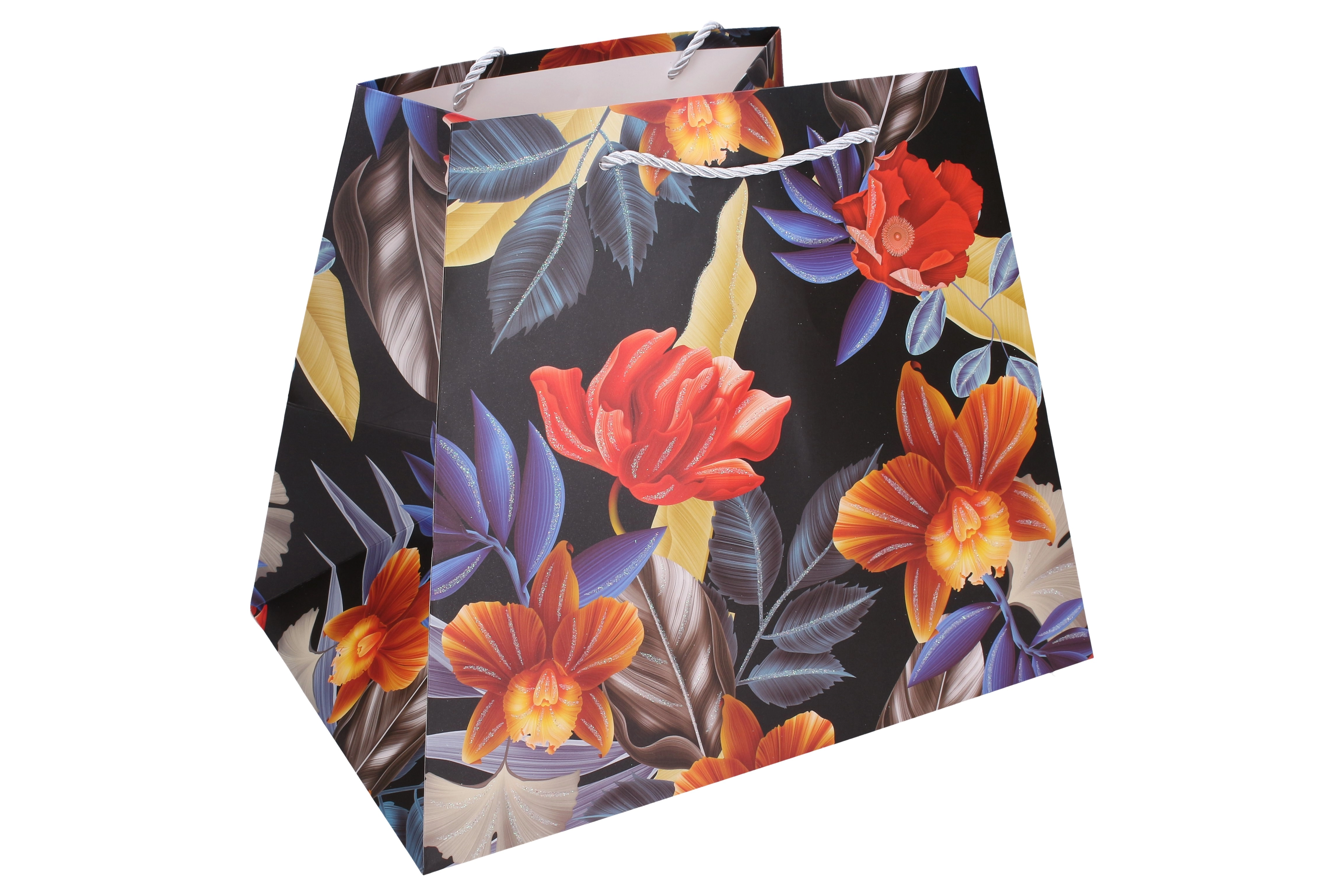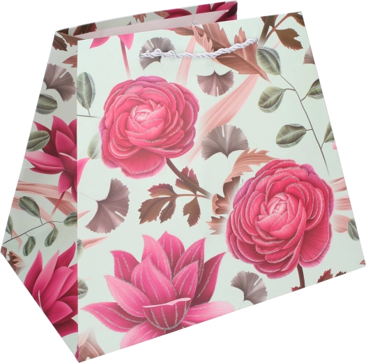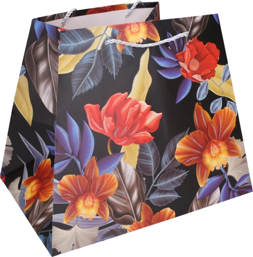 Offrez avec élégance. Ce sac cadeau en papier de qualité avec imprimé floral donne à votre présent une allure représentative. Sa forme stable avec fond élargi permet au sac de rester debout, tandis que les anses en corde résistantes assurent un port confortable et sécurisé.