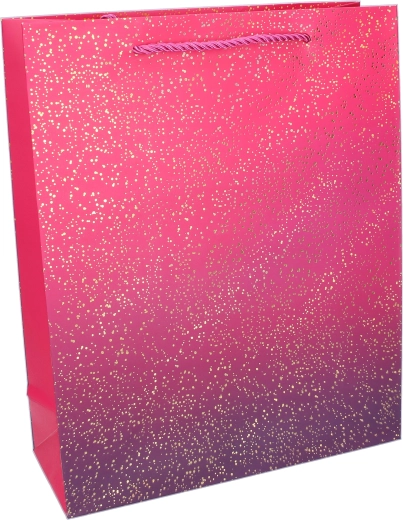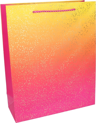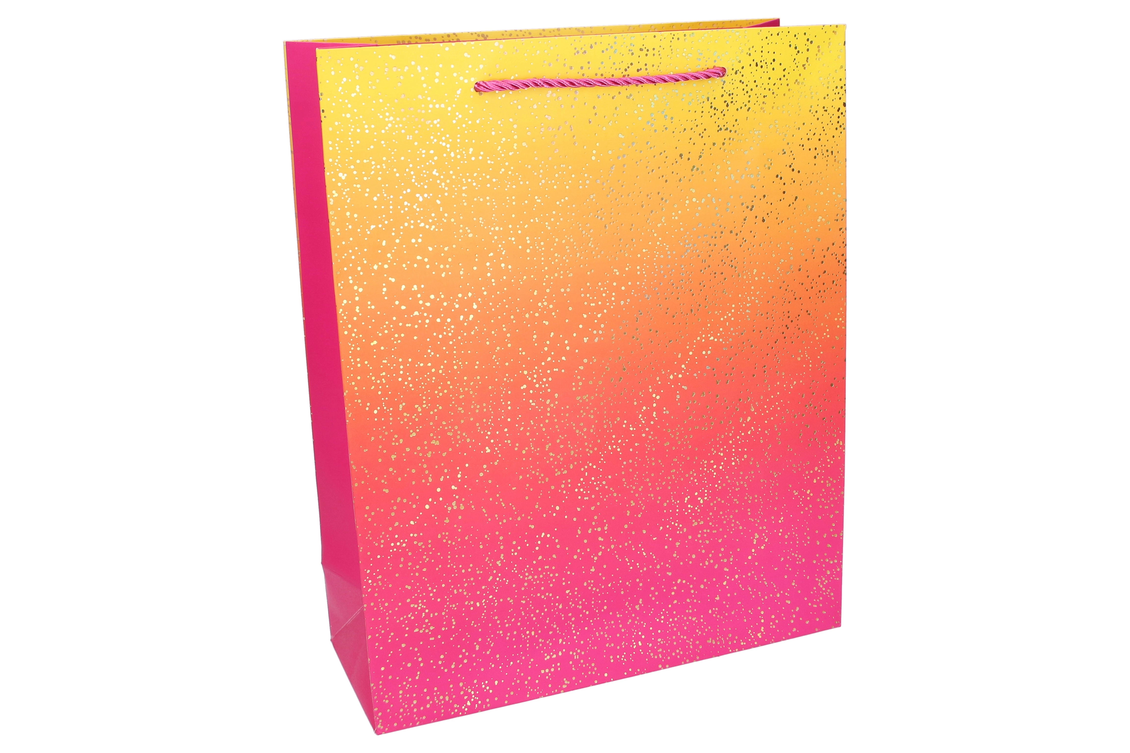 Ce sac cadeau utilisable toute l’année est idéal pour les anniversaires, mariages, fêtes et cadeaux d’entreprise. Le papier brillant à effet dégradé avec un discret imprimé « confetti » doré offre une touche luxueuse, tandis que la structure robuste garantit un emballage fiable de votre présent.