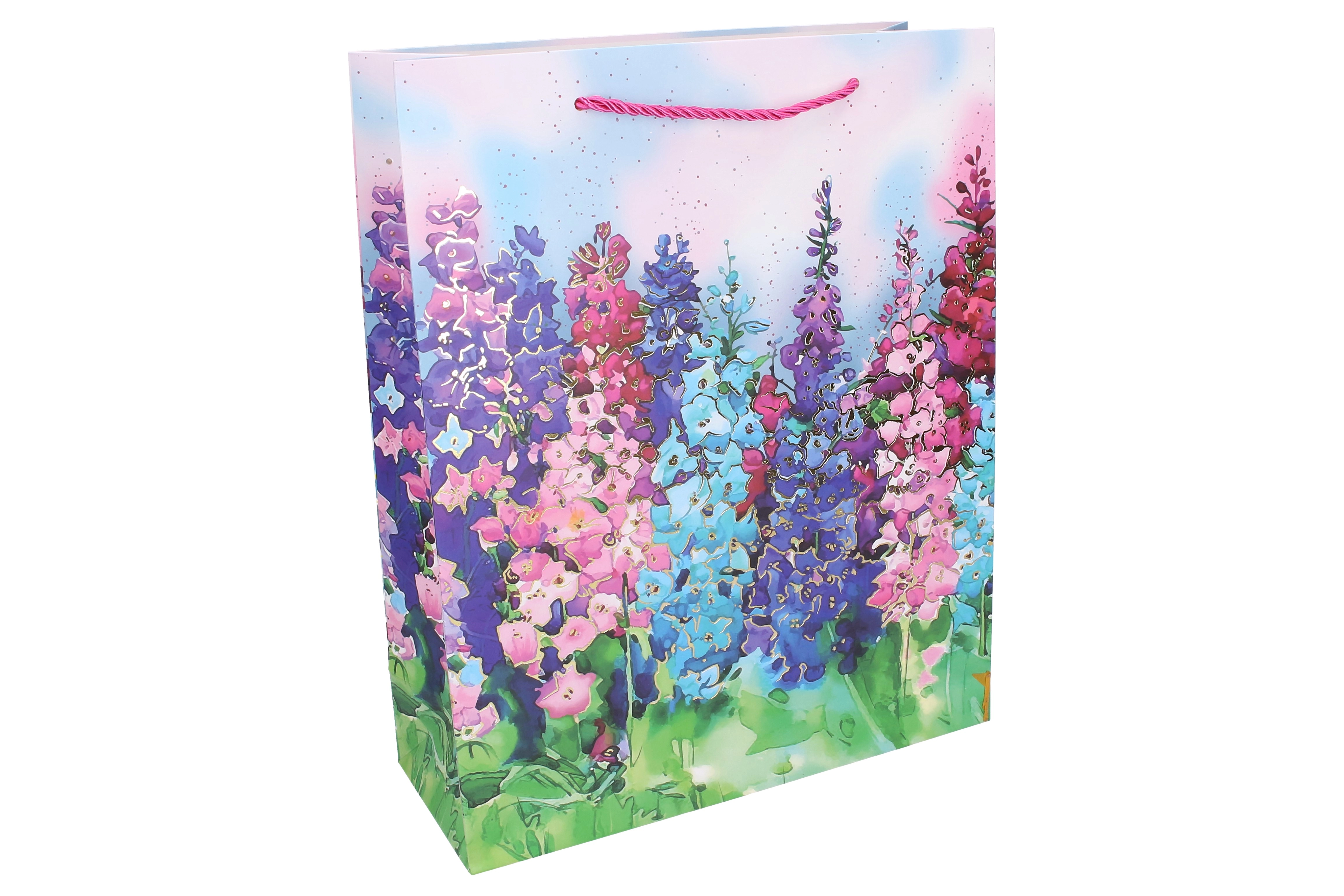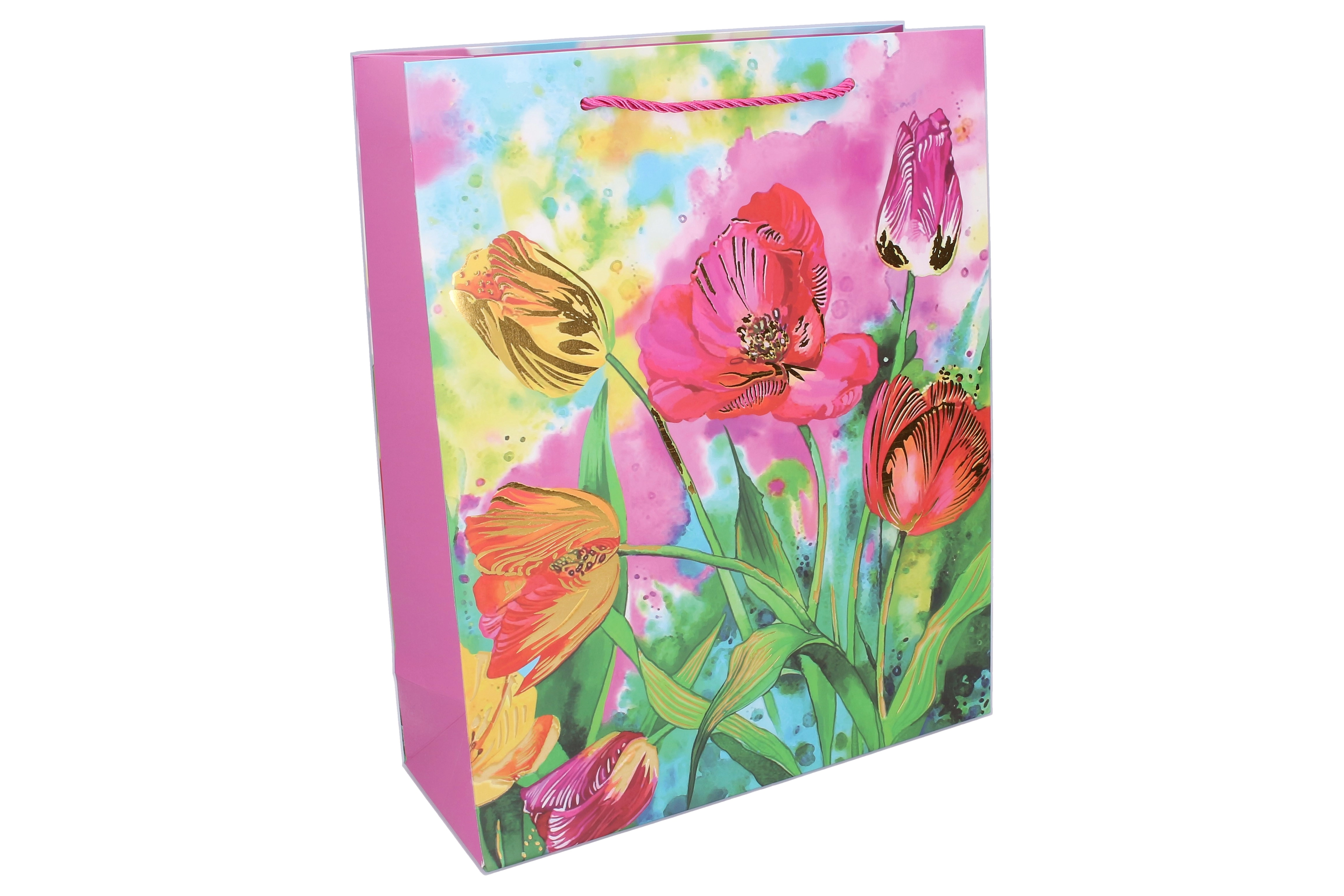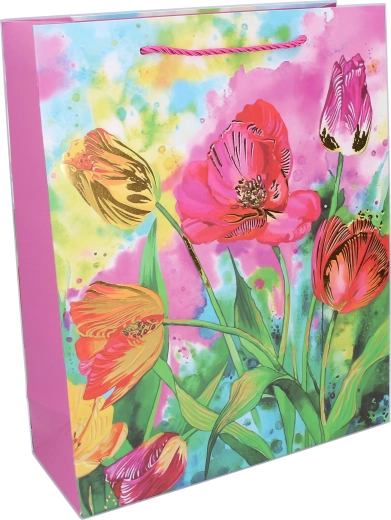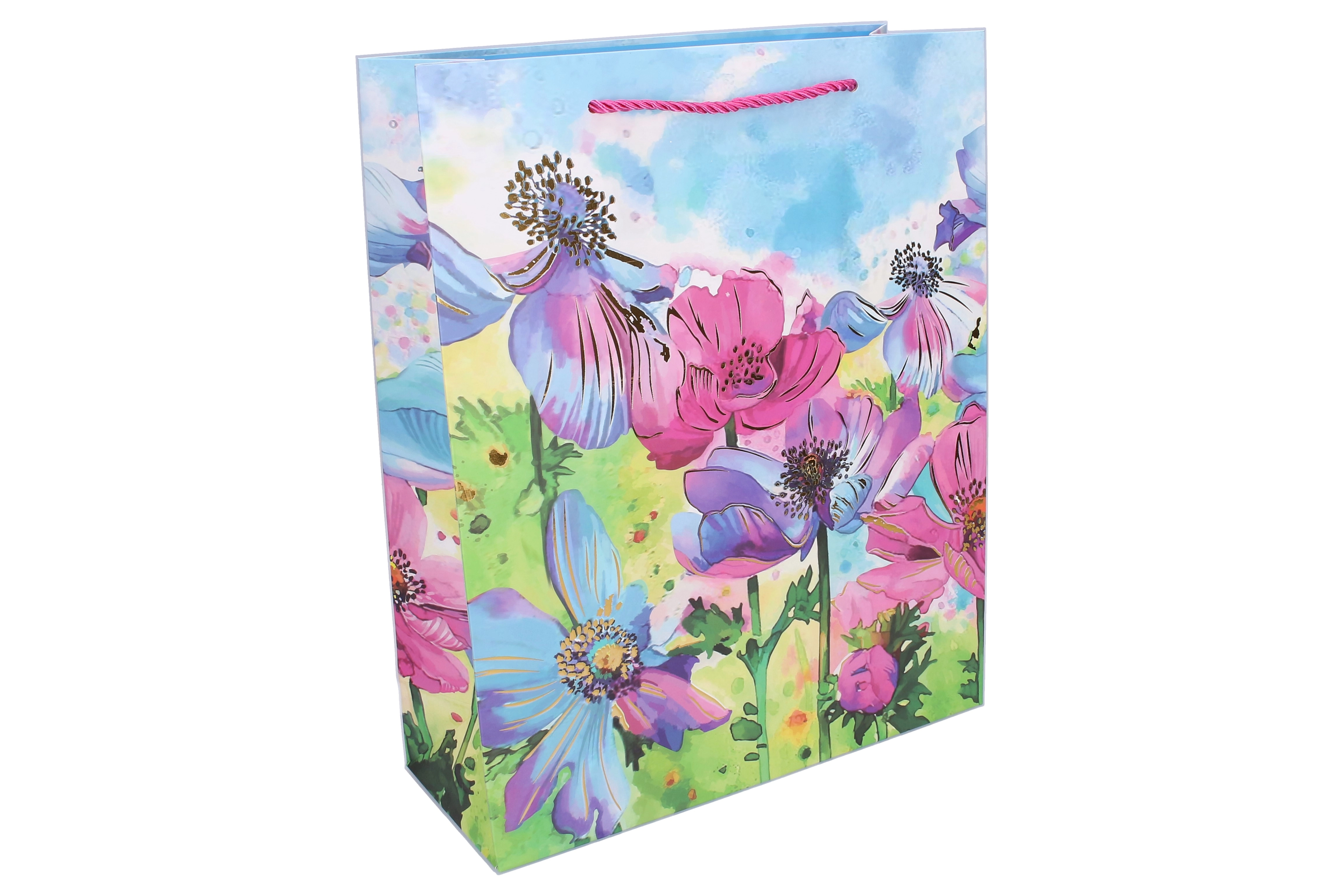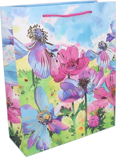 Élégant sac-cadeau taille M, dimensions 26 × 32 × 10 cm, avec motifs floraux, idéal pour offrir toute l’année. Il possède une finition brillante, une anse en corde robuste et une fabrication en papier résistante pour une remise de cadeaux sûre et stylée. Disponible en 4 variantes attrayantes avec imprimé floral.