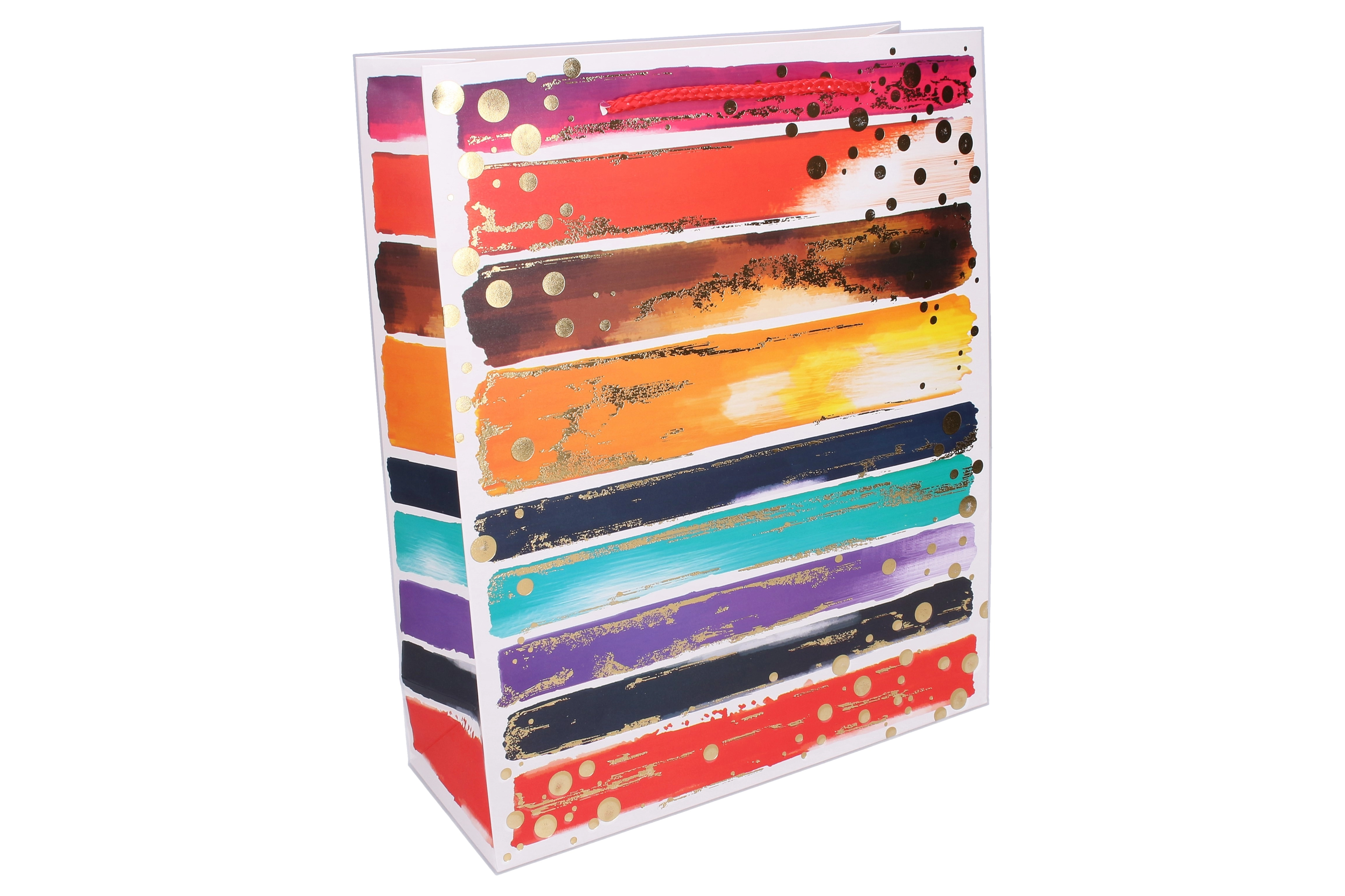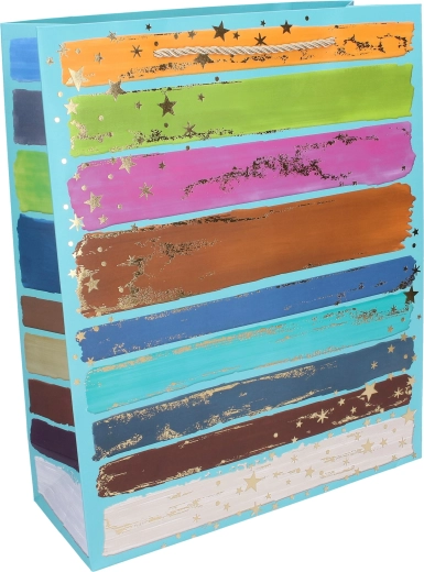 Ce sac cadeau polyvalent est idéal pour les anniversaires, les fêtes et les cadeaux d’entreprise. Grâce à son papier épais, ses anses de qualité et ses renforts, il supporte le contenu en toute sécurité tout en ayant une allure représentative. Le design moderne avec des coups de pinceau colorés et des éléments dorés métallisés confère un aspect premium à chaque présent.
