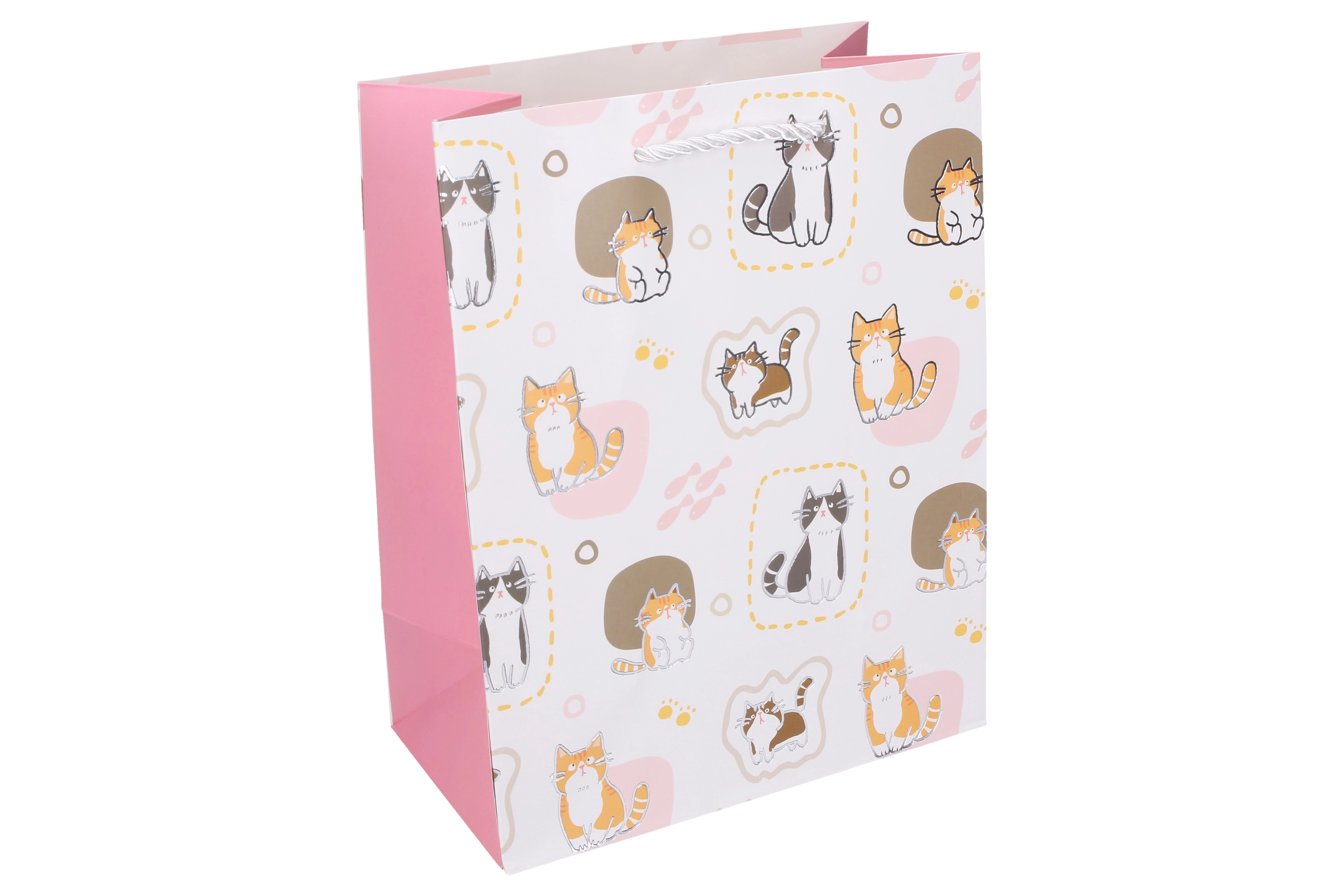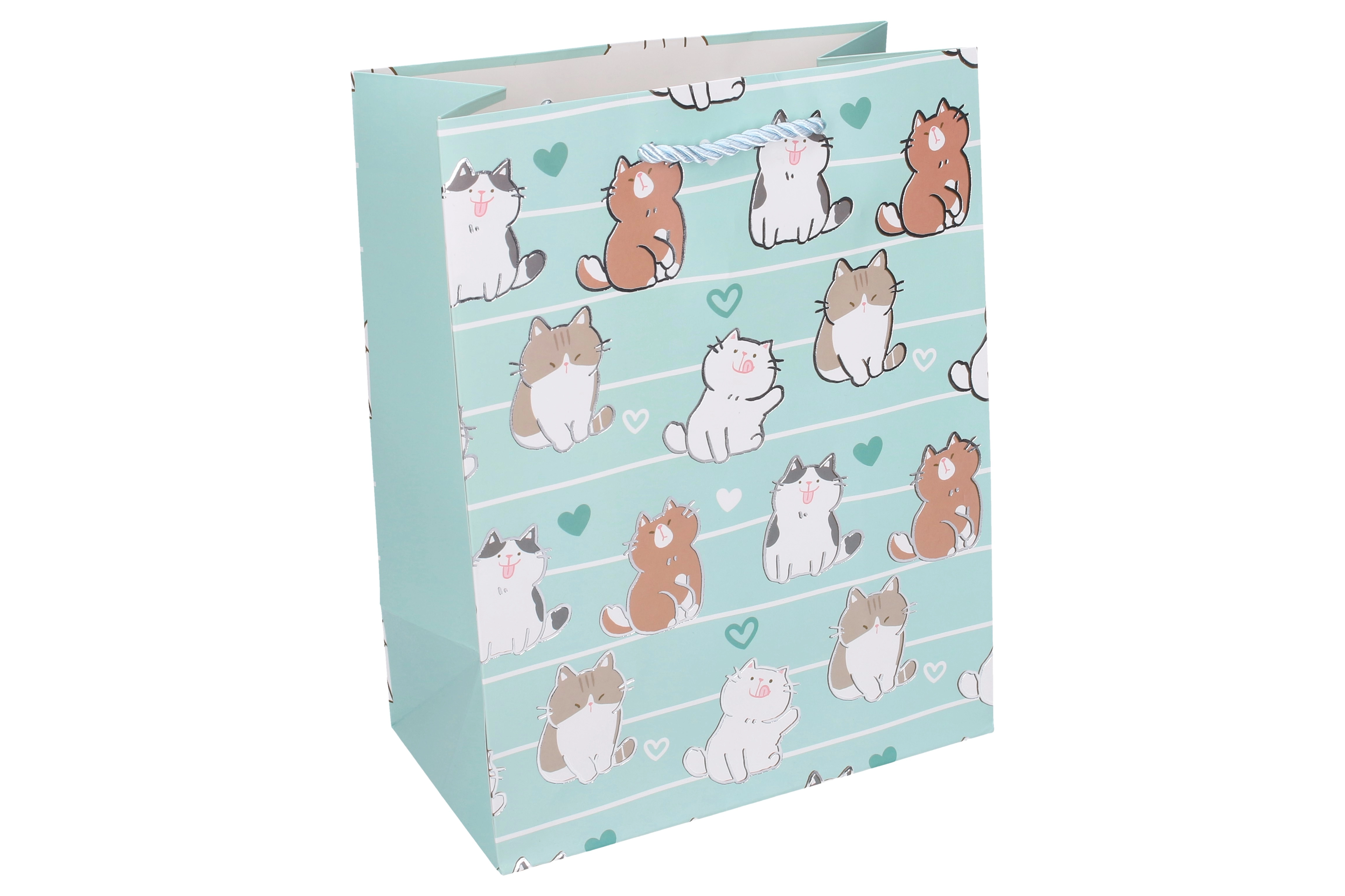 Le design à motifs de chats, décliné en plusieurs variantes pastel, est à la fois convivial et universel. Grâce à la base rectangulaire rigide, le sac tient debout tout seul, ce qui facilite le remplissage et garde les cadeaux bien rangés. Un excellent choix pour offrir un effet immédiat sans papier cadeau.