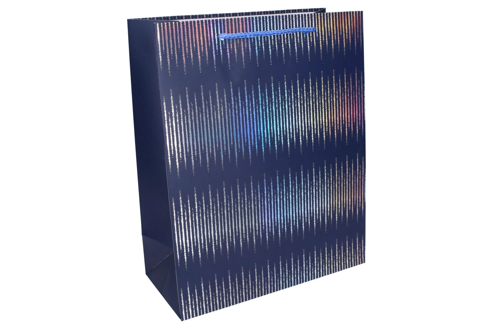 Ce sac cadeau compact apportera une touche d’élégance à vos surprises. Sa surface holographique brillante à effet rayé ou zigzag crée une impression premium, tandis que la construction en papier rigide conserve la forme et protège le contenu.