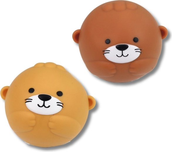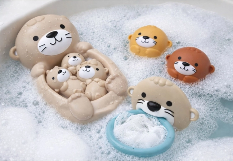La grande loutre avec ses petits et deux balles rondes flottent sur l’eau, invitent à être attrapées et pressées, et développent la coordination ainsi que la motricité fine.