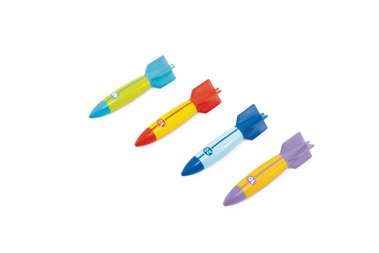 Chaque torpille possède des couleurs vives et un marquage numérique (10/20/30/40) pour une identification et un comptage des points aisés. Les ailettes de stabilisation facilitent la prise en main et le contrôle directionnel, permettant aux enfants de réaliser des lancers plus longs et plus précis sous l’eau – idéal pour des compétitions entre amis à la piscine ou au centre aquatique.