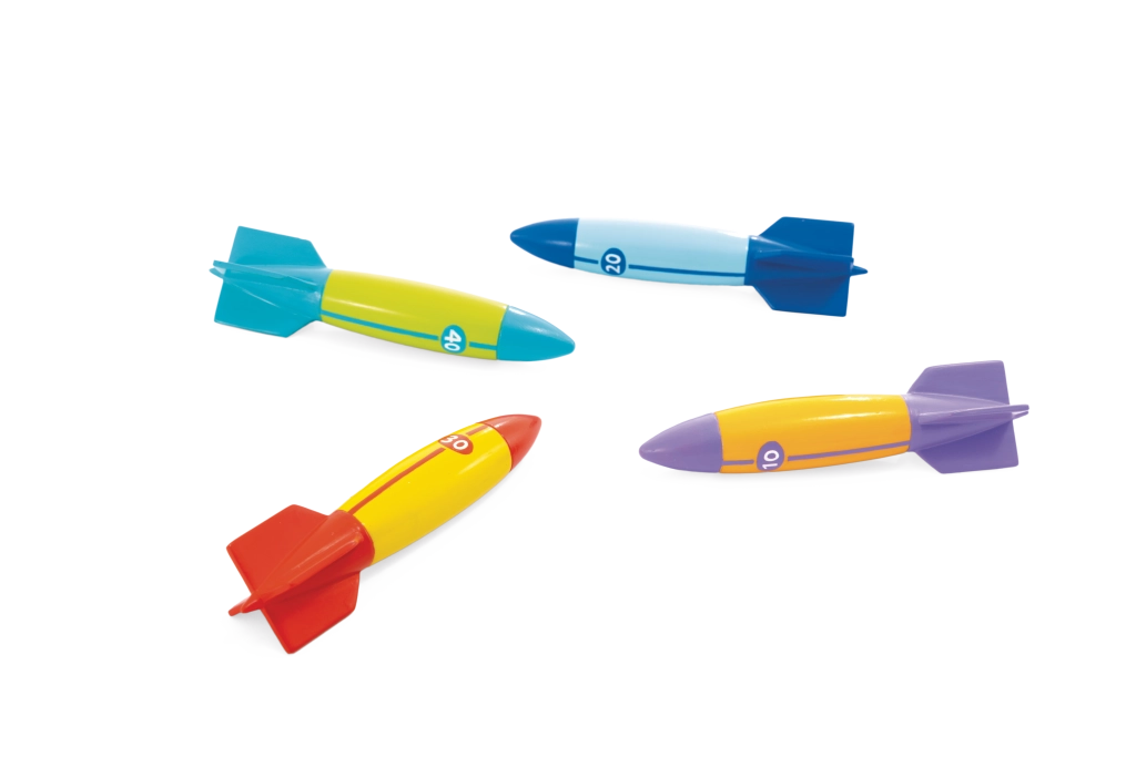 Amusant ensemble de quatre torpilles de plongée pour enfants dès 6 ans, idéal pour des jeux actifs en piscine. Grâce à leur forme aérodynamique, les torpilles glissent en douceur sous l’eau jusqu’à 6 m et portent des marquages colorés avec des valeurs de points pour des jeux compétitifs. Fabriquées dans un matériau souple mais résistant pour une utilisation sûre, avec de petites ailettes pour une prise en main sûre et un lancer précis. Idéal pour l’entraînement de la respiration, l’apnée et la coordination. Structure souple et sûre, glisse fluide jusqu’à 6 m, couleurs vives et marquage des points.