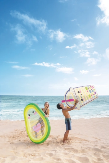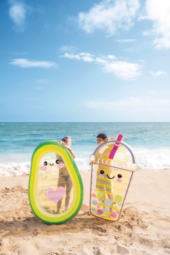Le matelas gonflable Avocado Buddy apporte une touche fraîche à votre détente estivale avec un design inspiré de l’avocat. Le bord extérieur dans des nuances de vert se fond dans des tons plus clairs et du jaune, tandis que le centre transparent avec un visage de dessin animé et un cœur rose donne au matelas une apparence originale. Le PVC transparent et résistant est idéal pour les jeux aquatiques et permet d’observer ce qui se passe sous la surface.