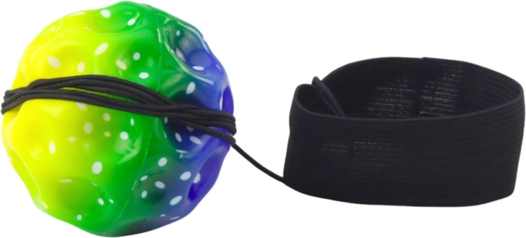 Balle sensorielle antistress avec cordon élastique et bracelet de poignet qui revient après chaque lancer ou coup, évitant aux enfants de devoir la poursuivre. Les couleurs arc-en-ciel encouragent le mouvement et la surface alvéolée masse agréablement les doigts, soutenant la motricité fine et la concentration.