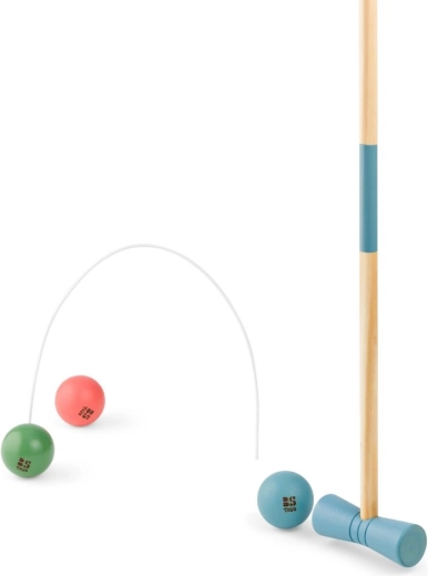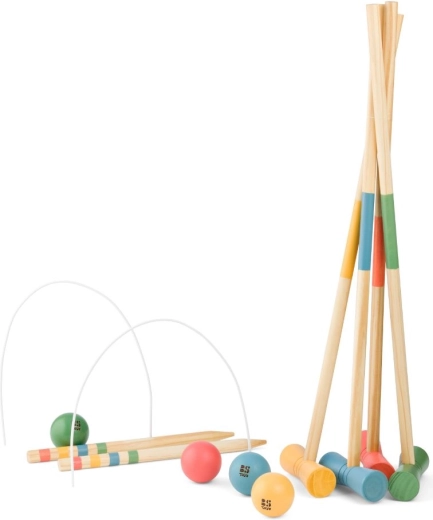 L’emballage comprend 4 maillets en bois, 2 piquets de but, 10 arceaux et des boules en bois de 5 cm de diamètre. Le bois provient de forêts gérées de manière responsable. Pour un démarrage facile, vous pouvez scanner le code QR dans l’emballage et télécharger le manuel en tchèque et en slovaque.