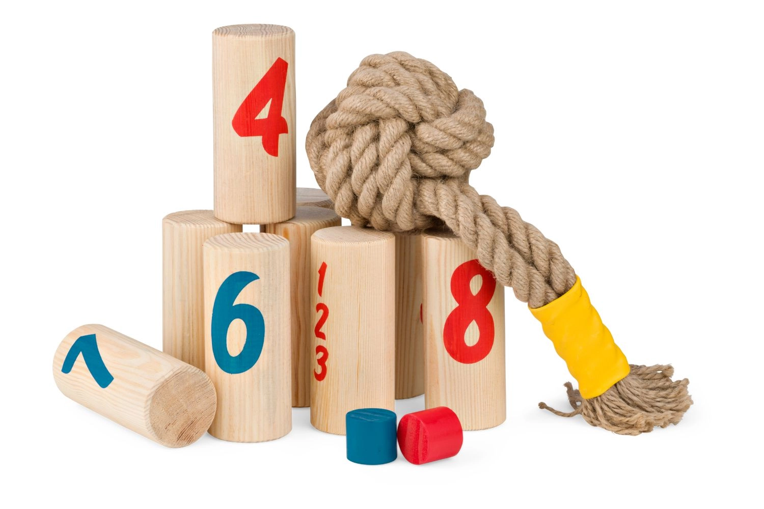 Contenu de la boîte : 7 poteaux en bois (14 × 6 × 6 cm), 2 pions (3,5 × 3,5 × 3 cm), 1 nœud de lancer, une feuille de score.