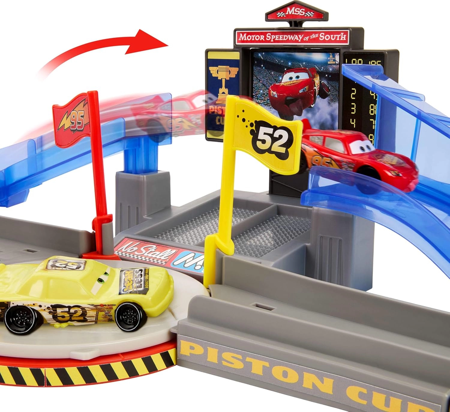 Vivez des moments de cinéma à la maison. En mode carambolage, faites tourner le panneau jaune pour préparer la zone d’impact. Placez Flash McQueen dans le lanceur et visez – un tir réussi garantit une course fluide sans obstacles, sinon une collision spectaculaire survient avec la voiture « cabossée ». En mode course, actionnez l’aiguillage, lancez-vous sur la rampe et admirez un super saut de cascade. L’écran rotatif projette le héros sur le « téléviseur géant » pour encore plus de suspense.