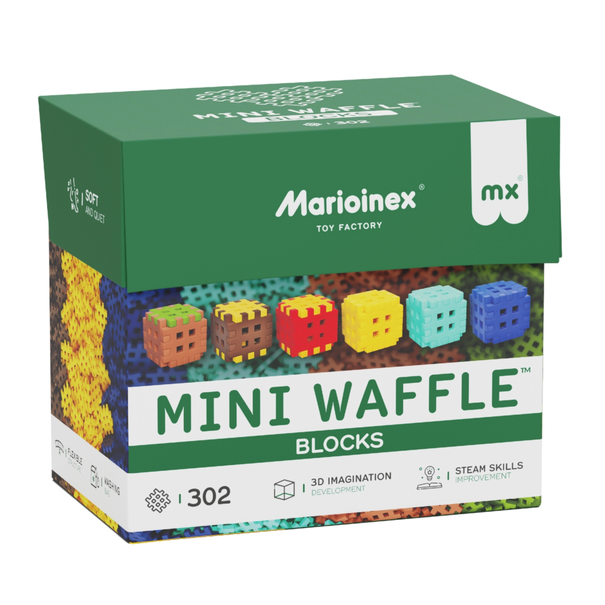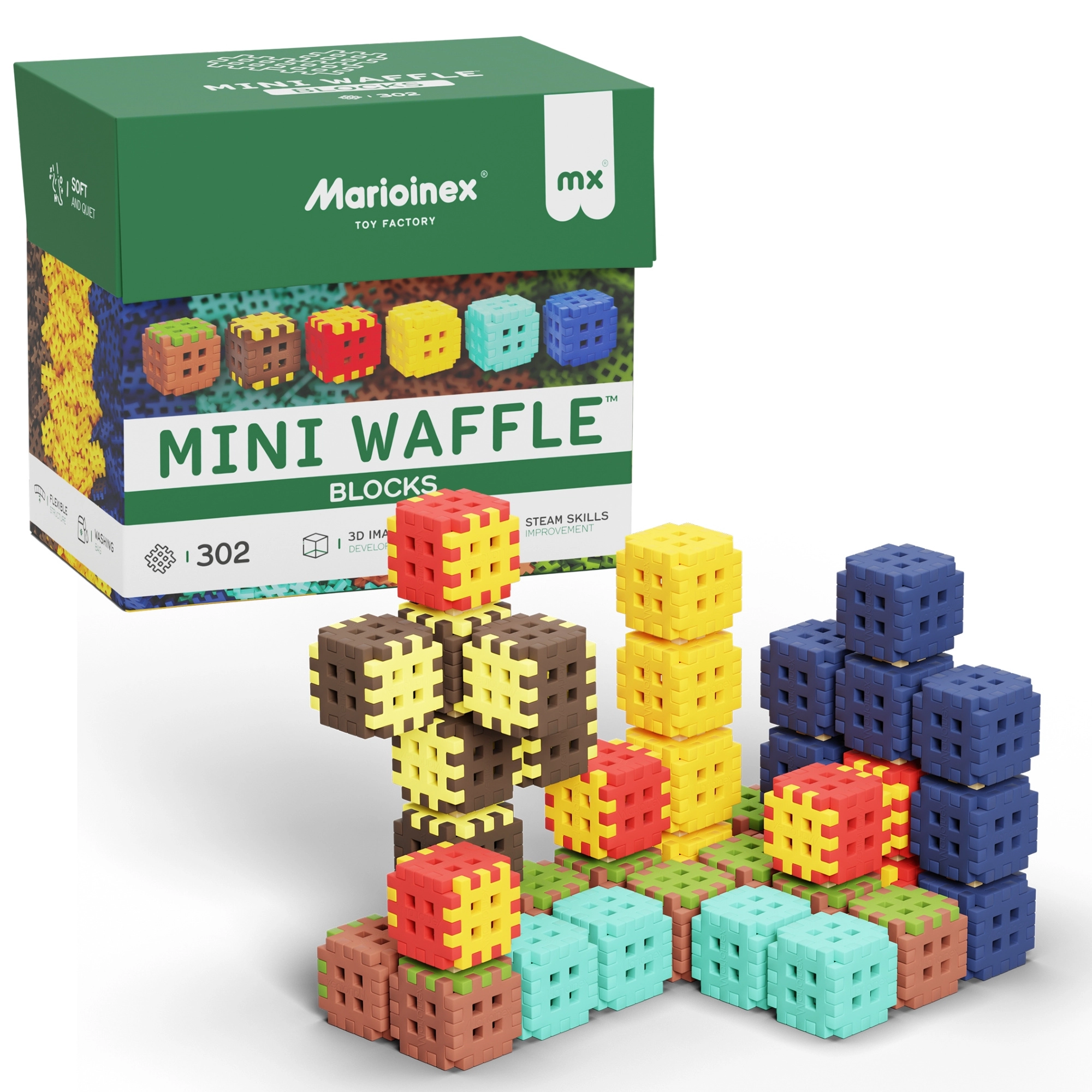 Le set Mini Waffle Blocks développe la créativité, la motricité fine et la représentation spatiale. Il apprend aux enfants la pensée logique et la patience par le jeu. Les éléments sont conçus pour les petites mains et, grâce à la matière souple, offrent une expérience sensorielle agréable.