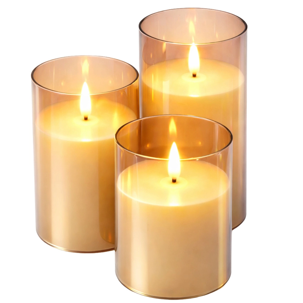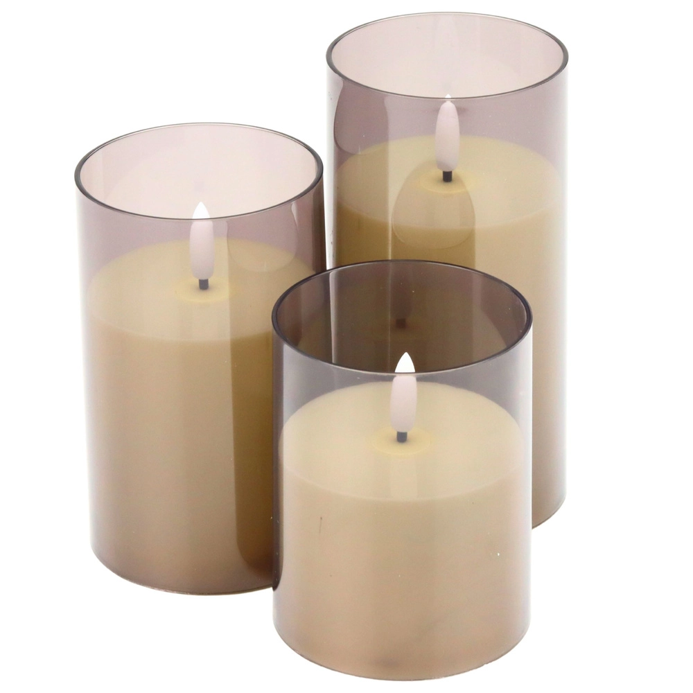 Élégant lot de 3 bougies LED de hauteurs différentes créant une ambiance chaleureuse et agréable sans fumée ni flamme nue. Grâce à l’effet de flamme réaliste, au minuteur et au réglage de la luminosité sur la télécommande, elles sont idéales pour le salon, la chambre ou une table de fête. Solution sûre pour les foyers avec enfants et animaux de compagnie.