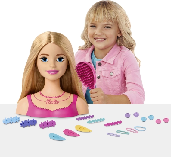 Un buste élégant avec un top rose et un collier BARBIE au rendu réaliste qui invite les petites coiffeuses au jeu créatif.