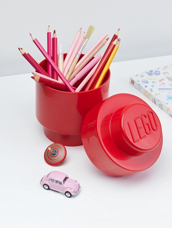 Boîte ronde stylée en forme de brique LEGO, idéale pour le rangement organisé des crayons, règles, briques et petites jouets. Résistant polypropylène (PP), matériau sûr sans BPA, phtalates ni PVC, dimensions pratiques pour tout bureau ou chambre d’enfant.