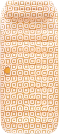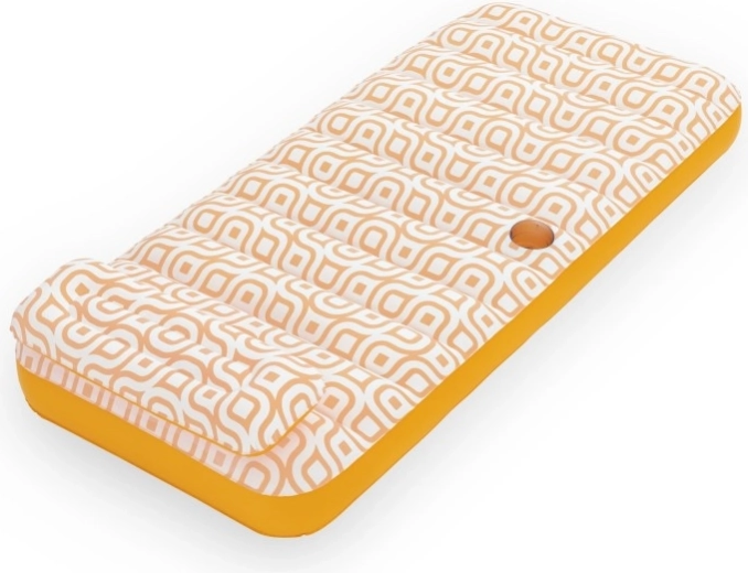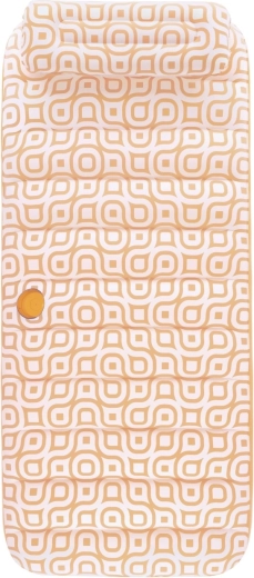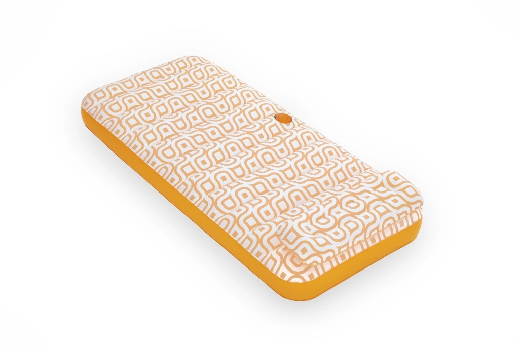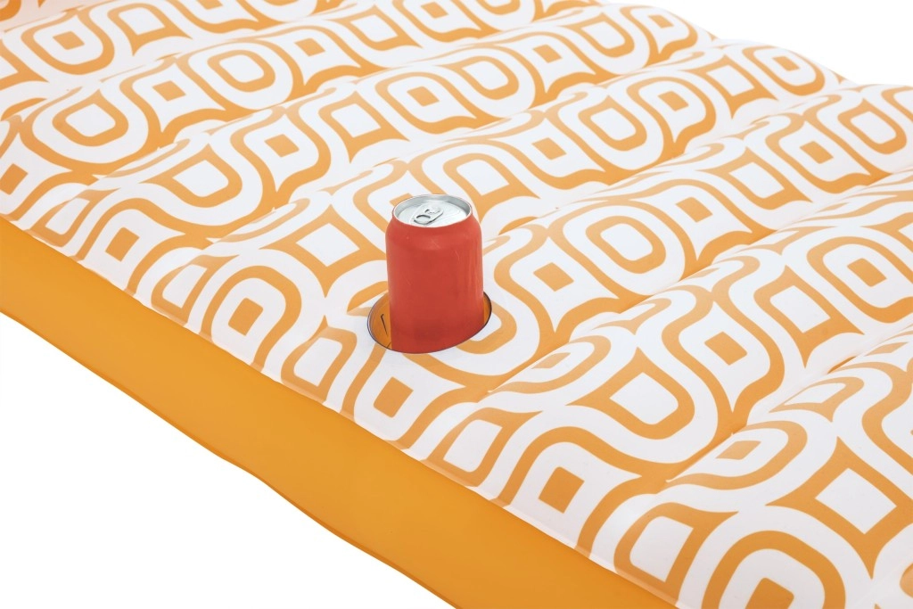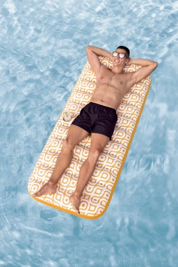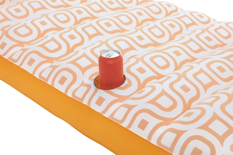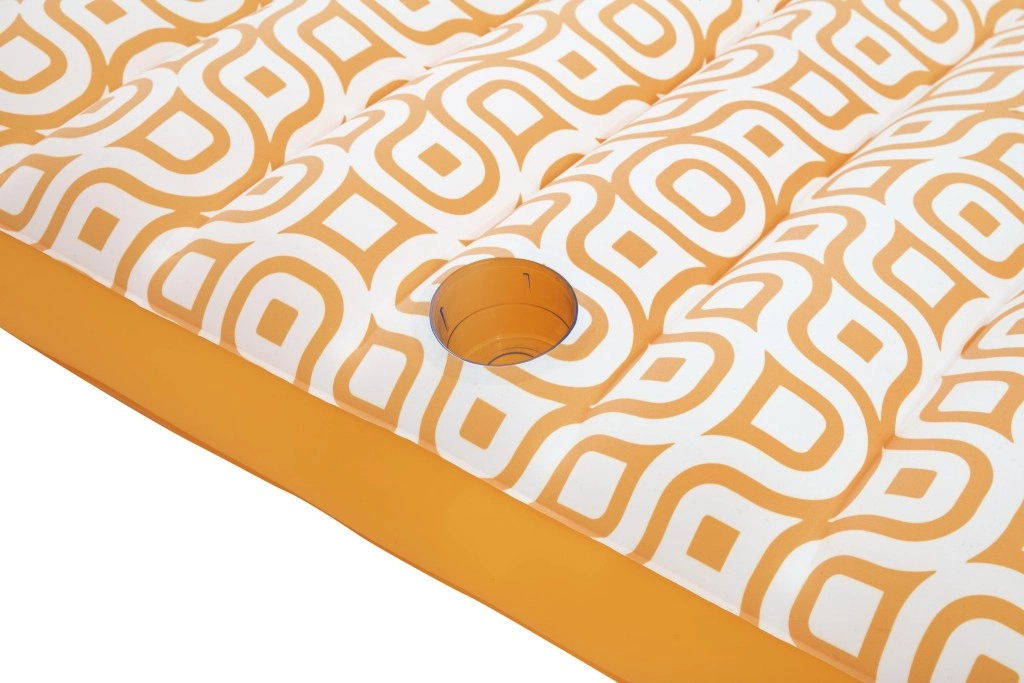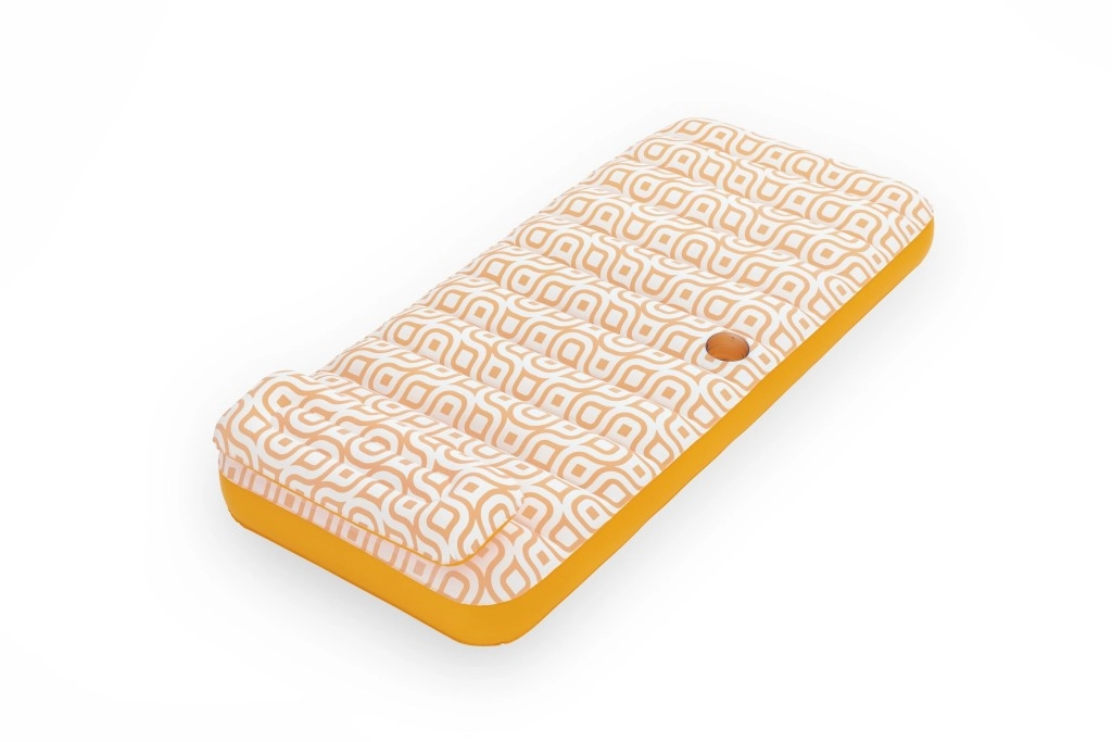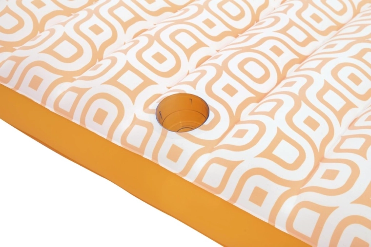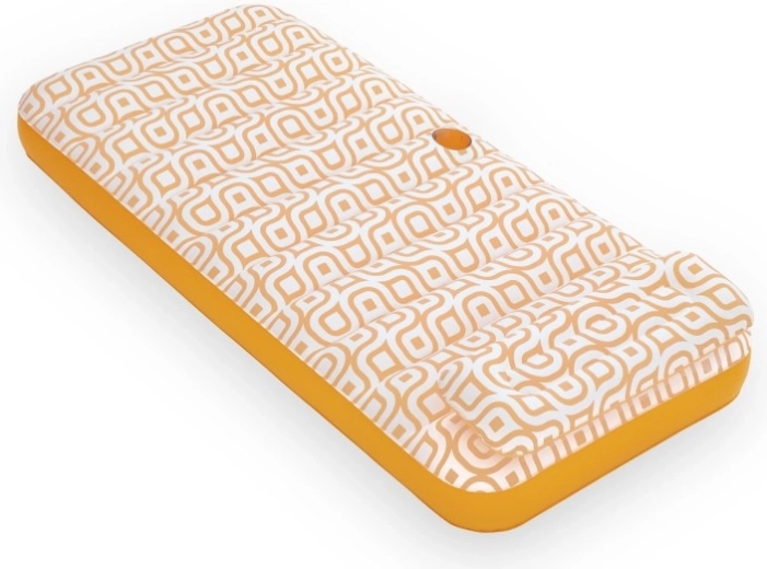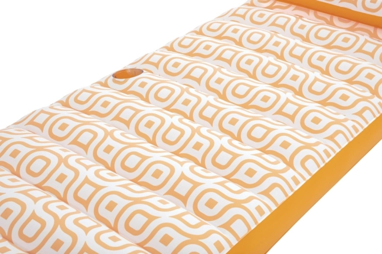 Le matelas gonflable Comfort Plush est un excellent choix pour se détendre au bord de la piscine ou sur des eaux calmes. Sa surface spacieuse de 183 × 84 cm supporte aisément un adulte jusqu’à 100 kg, tandis que l’oreiller intégré assure un appui confortable de la tête. Son revêtement velouté et imperméable, au motif géométrique rétro dans des tons blanc‑orange, offre une allure élégante et une sensation agréable au toucher.