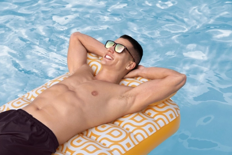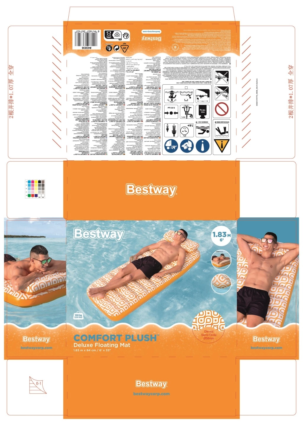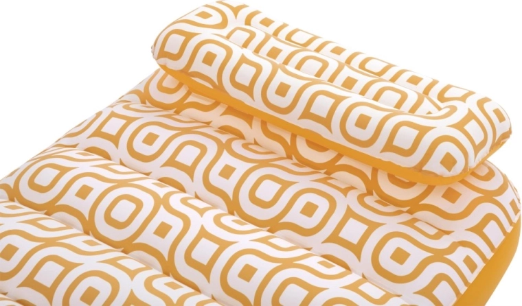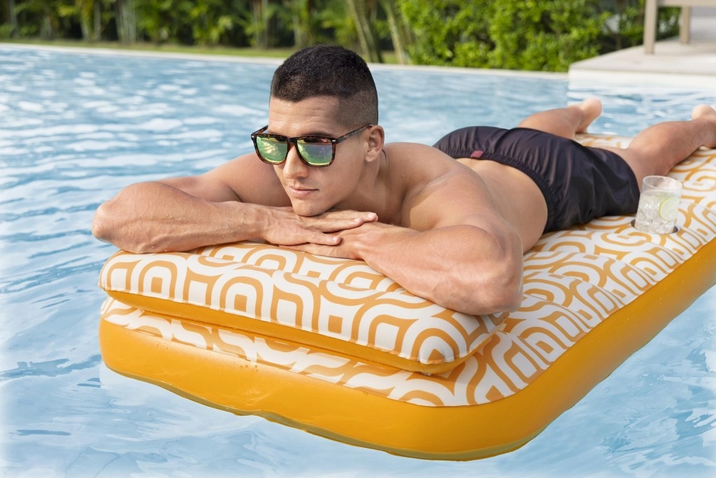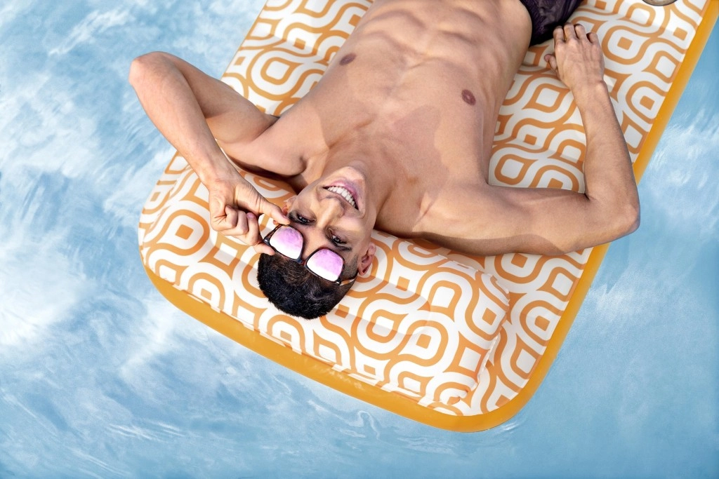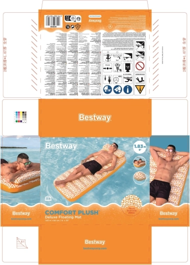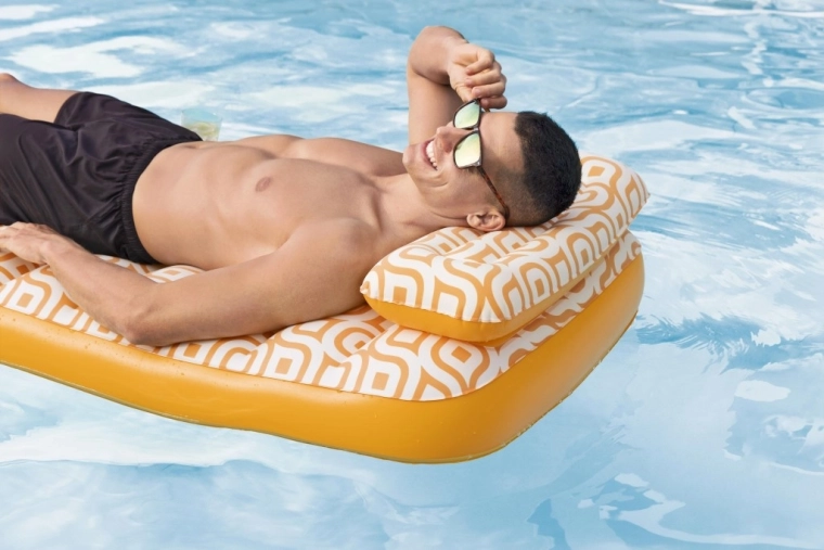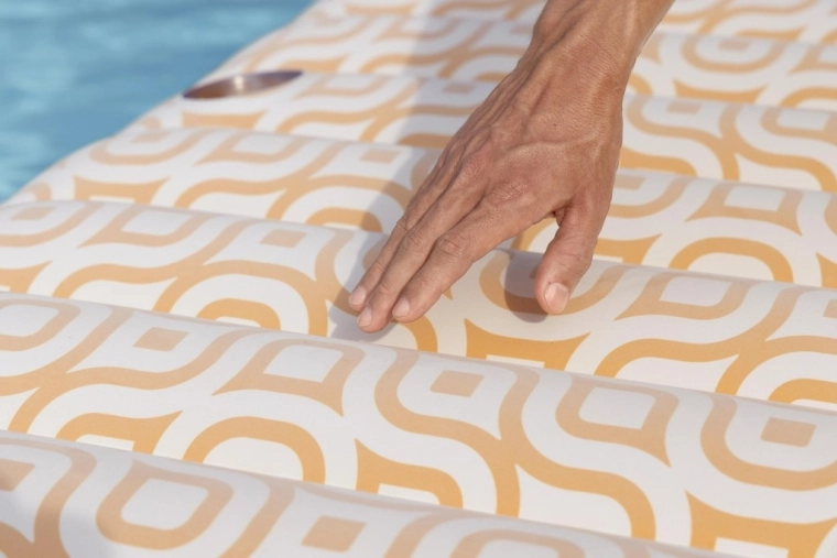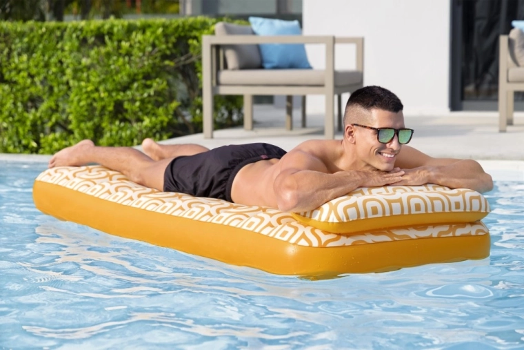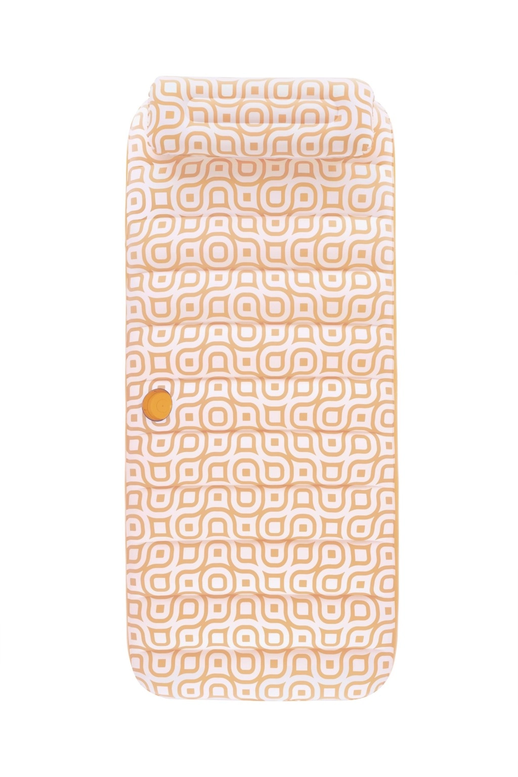 Le matelas gonflable Comfort Plush est un excellent choix pour se détendre au bord de la piscine ou sur des eaux calmes. Sa surface spacieuse de 183 × 84 cm supporte aisément un adulte jusqu’à 100 kg, tandis que l’oreiller intégré assure un appui confortable de la tête. Son revêtement velouté et imperméable, au motif géométrique rétro dans des tons blanc‑orange, offre une allure élégante et une sensation agréable au toucher.
