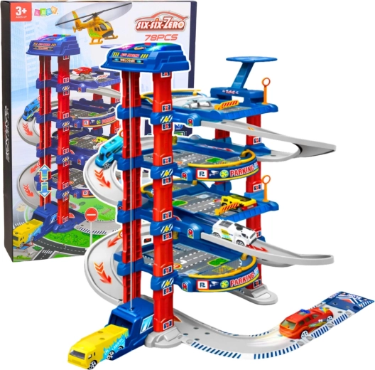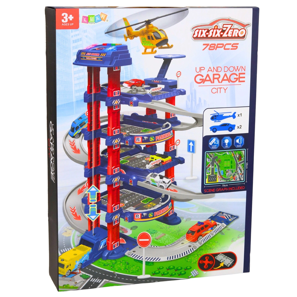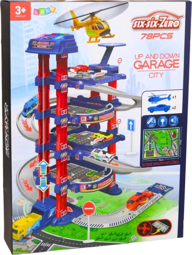 Le grand parking pour enfants est conçu pour les petits passionnés de voitures et de circulation urbaine. L’ascenseur électrique emmène facilement les petites voitures aux étages supérieurs, d’où elles peuvent dévaler la piste de descente. Il comprend également une aire d’atterrissage pour hélicoptère, des panneaux de signalisation et un tapis de jeu au sol qui créent un environnement urbain réaliste.