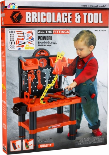 Établi créatif pour enfants avec un riche ensemble d’outils, idéal pour la chambre, le garage ou la salle de jeux. Il offre une surface stable, une hauteur de 70 cm et des rangements astucieux pour garder l’ordre. Inclus une perceuse à piles, étaux réglables, pegboard pour outils, règle graduée sur le plateau et de nombreux accessoires pour jouer au petit bricoleur. Développe la motricité fine, la pensée logique et la créativité.