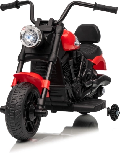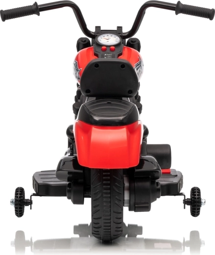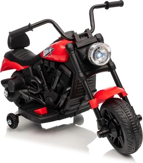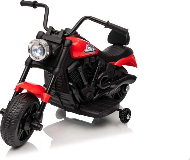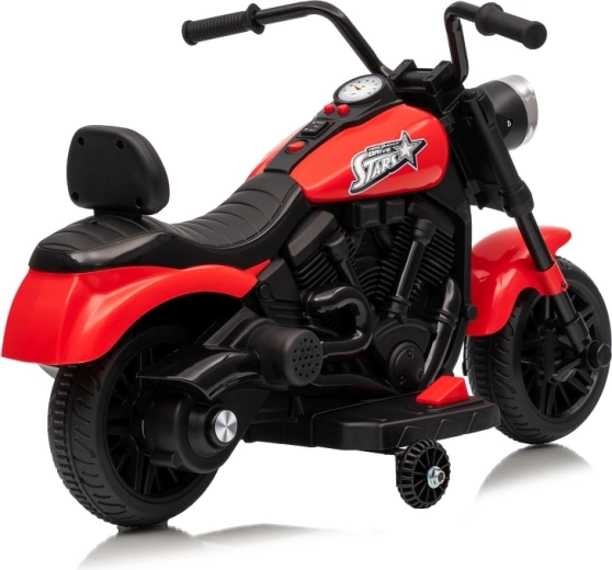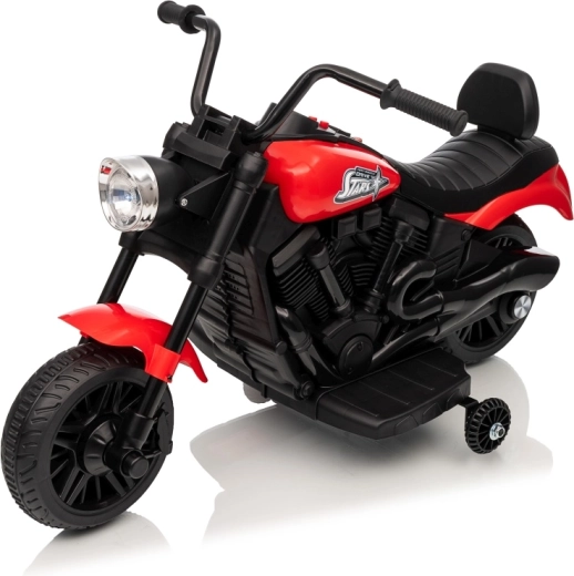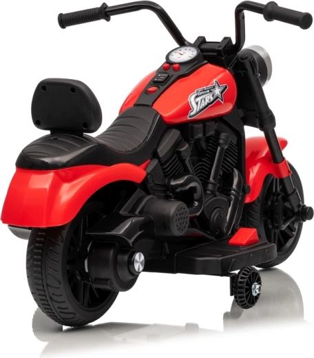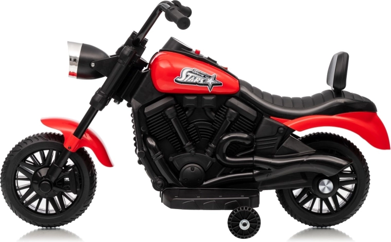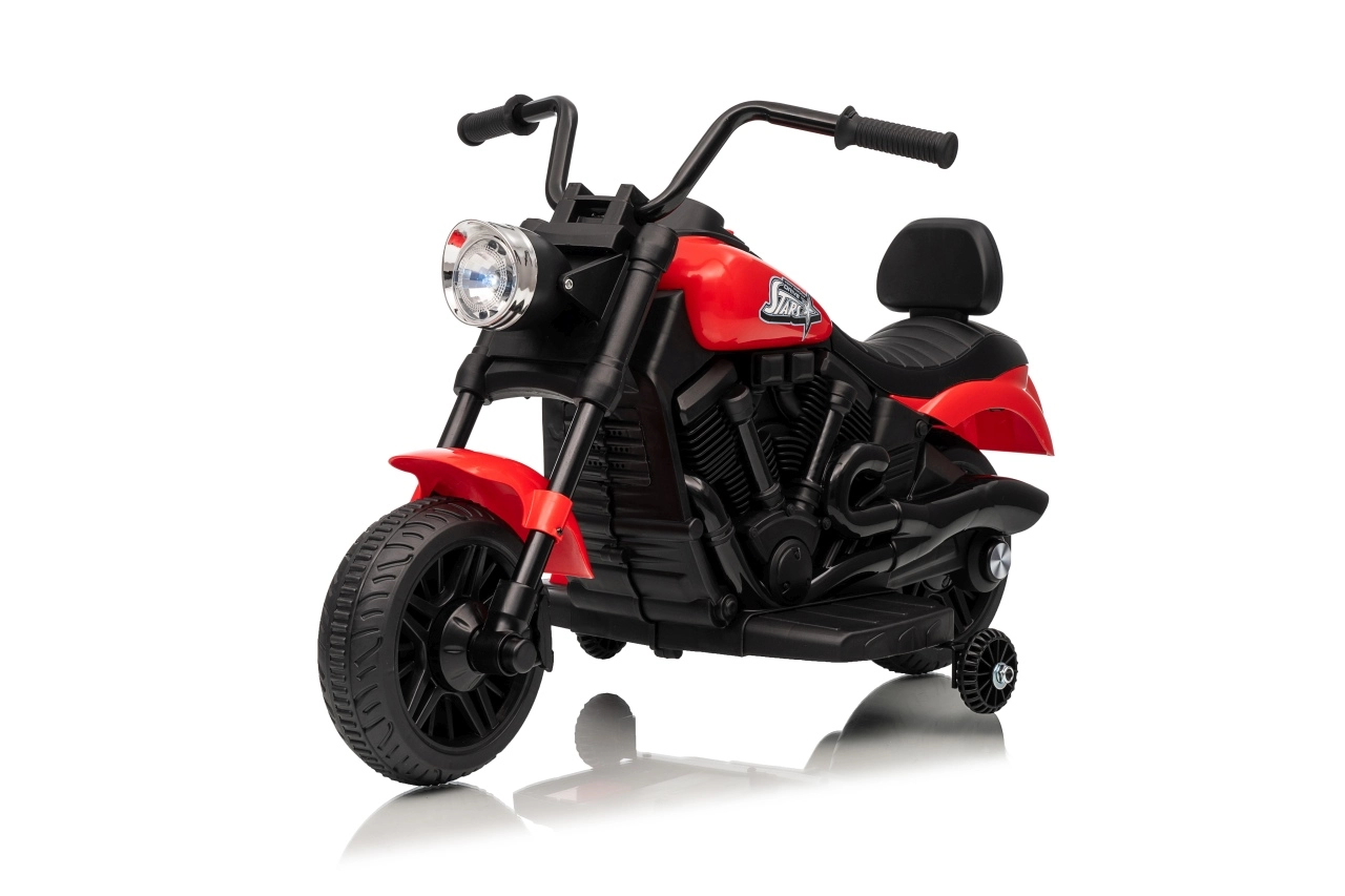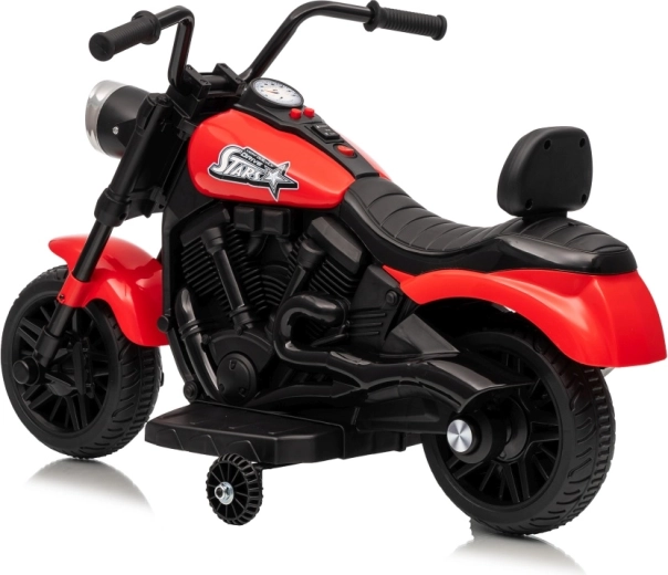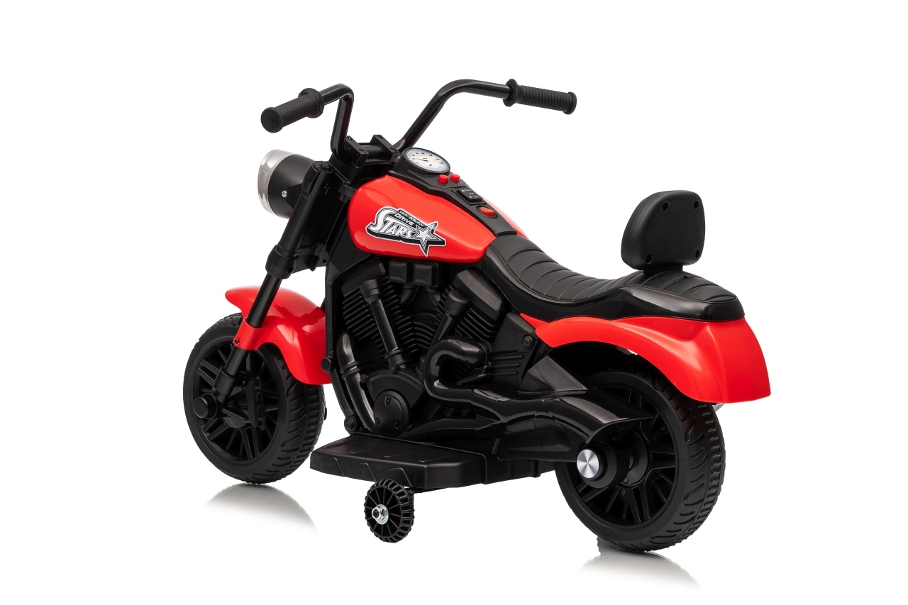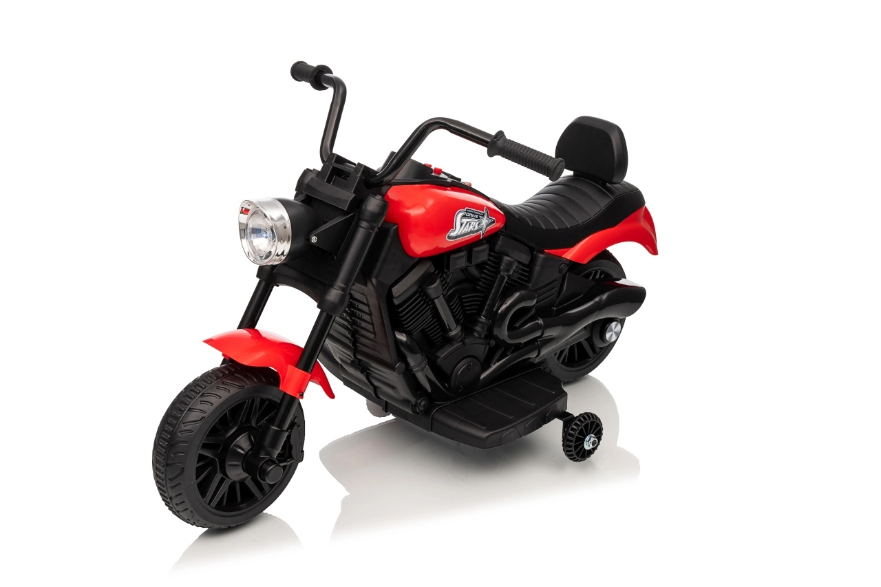 La moto électrique pour enfants STAR au coloris rouge offre un divertissement sûr pour les petits pilotes. Elle est équipée d’un moteur de 30 W, d’une batterie 6 V 4,5 Ah, d’un démarrage progressif pour un départ en douceur, de la marche avant et arrière et d’un phare LED avant. La stabilité est assurée par des roulettes latérales et le confort par une selle profilée avec dossier.