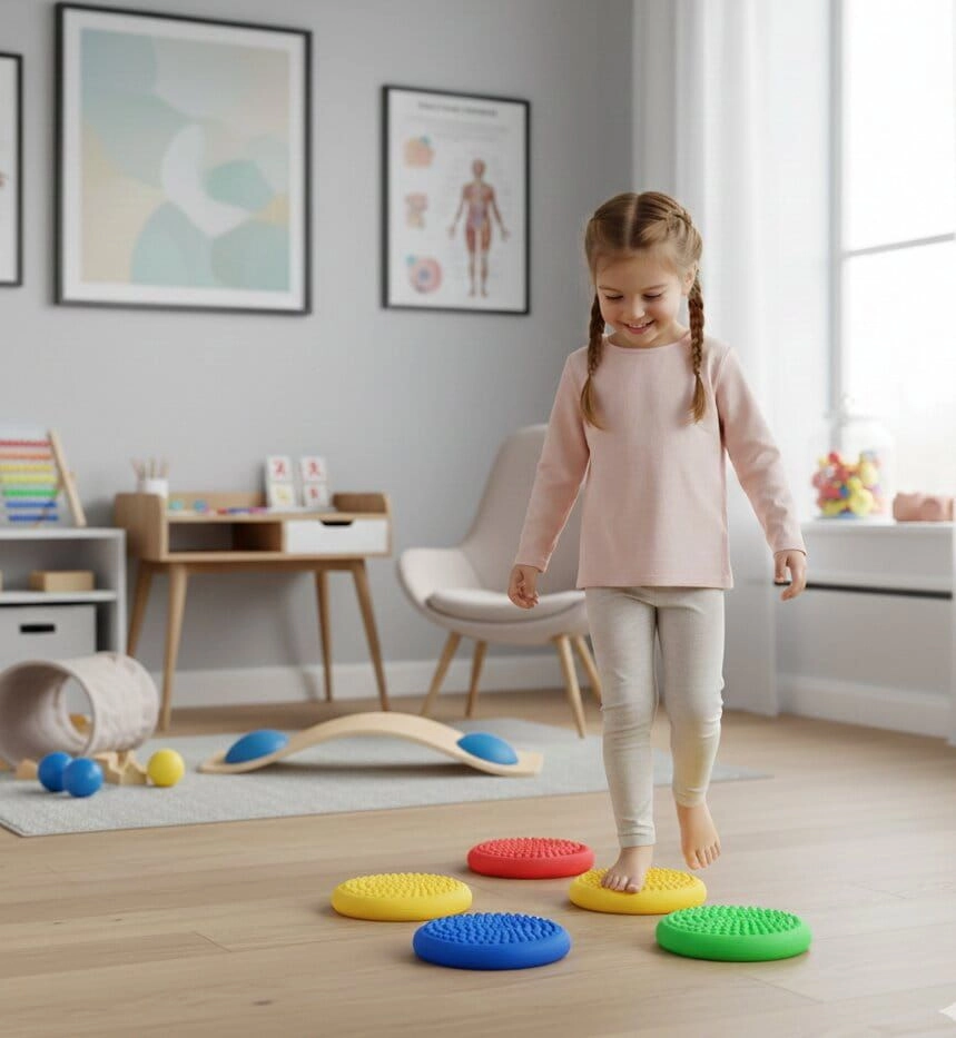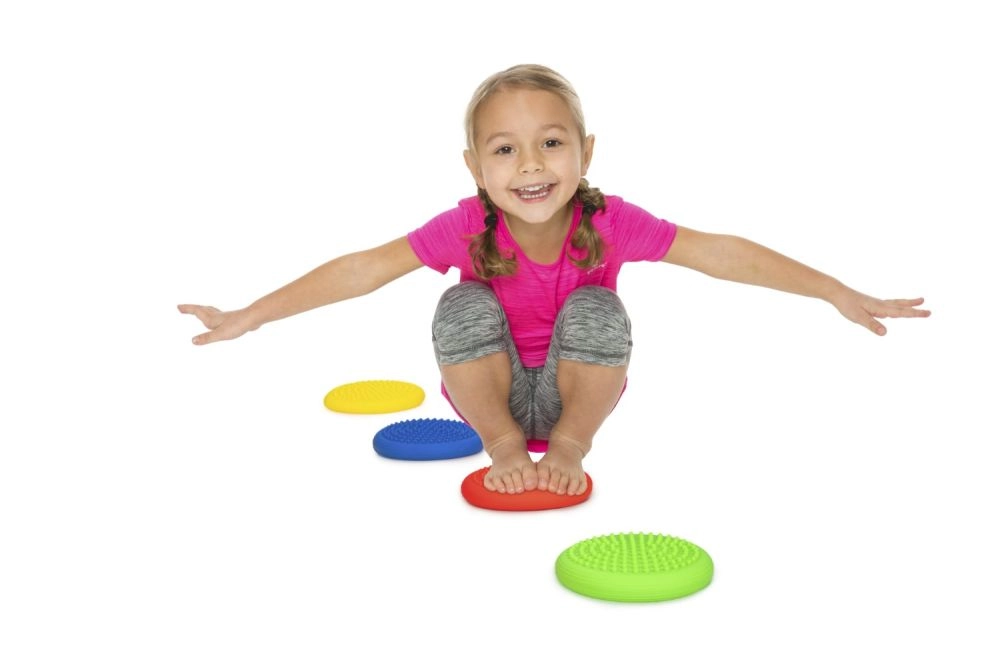 Les disques colorés motivent les enfants à bouger, développent la coordination, la proprioception et renforcent le système stabilisateur profond.