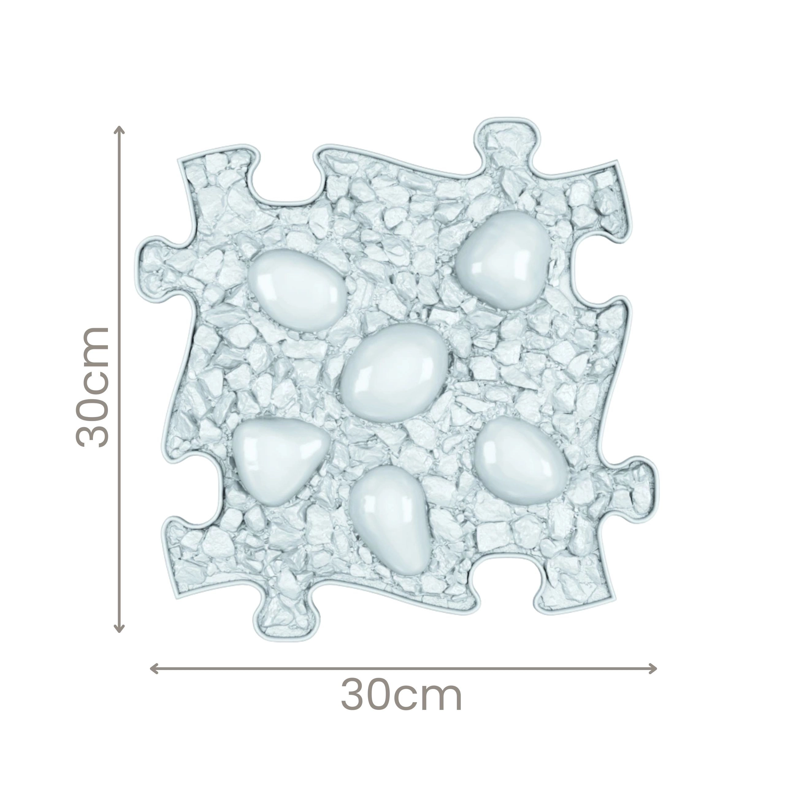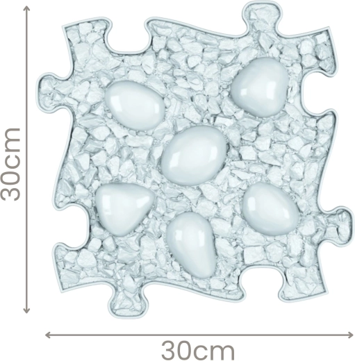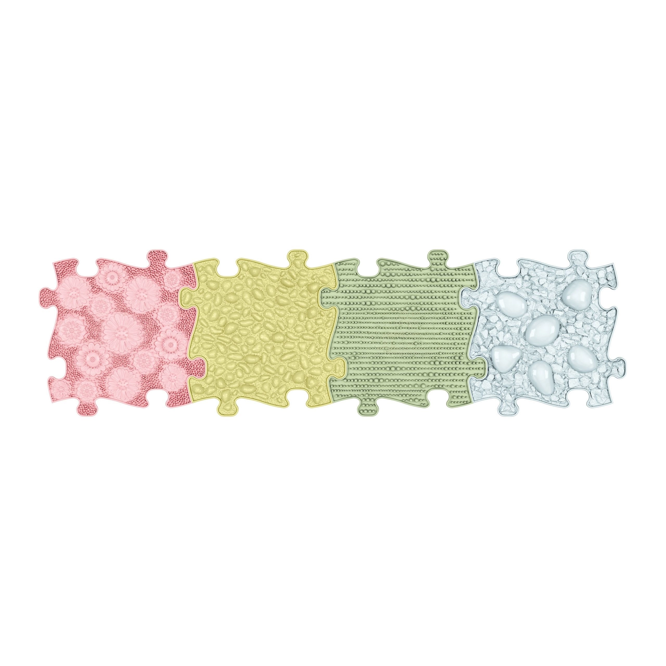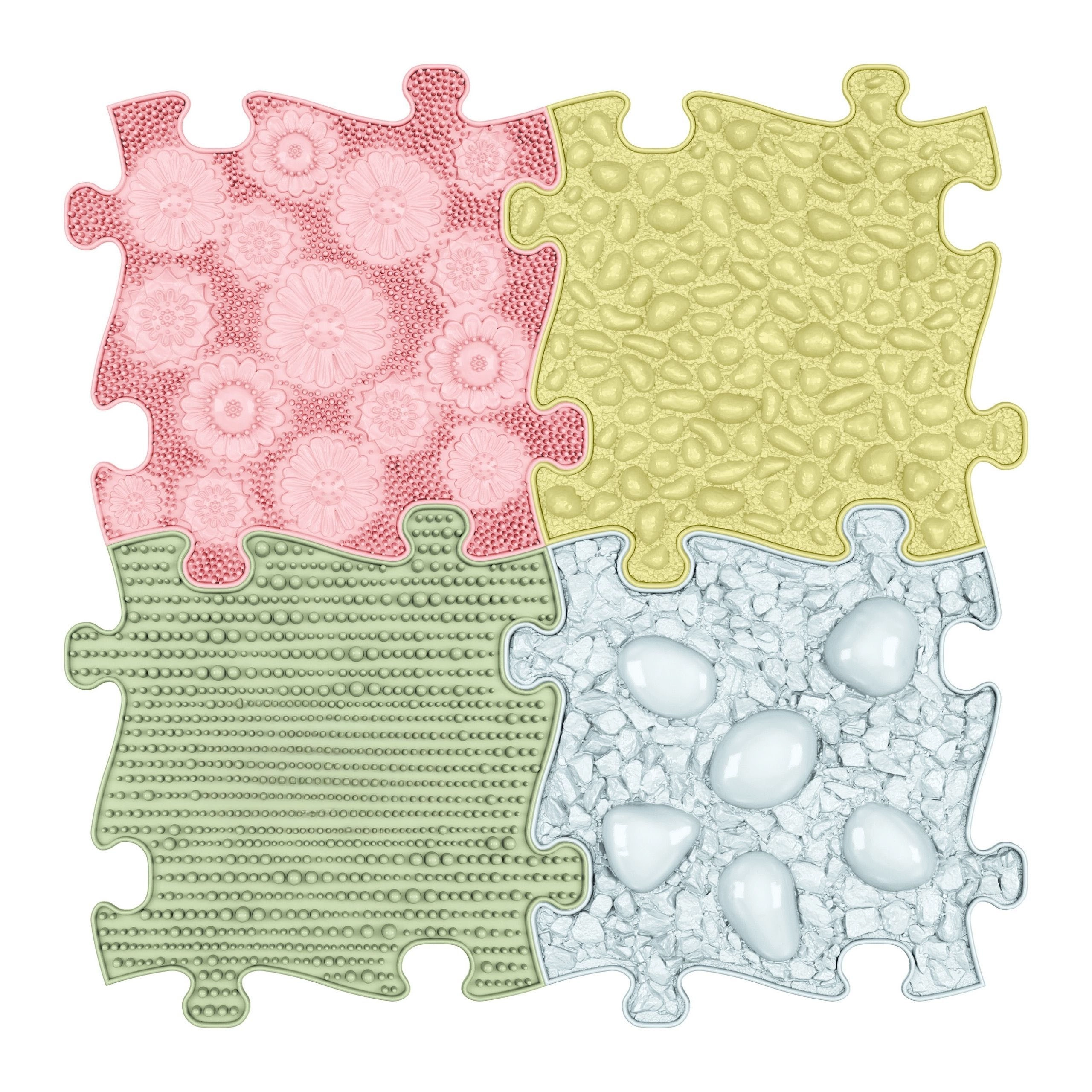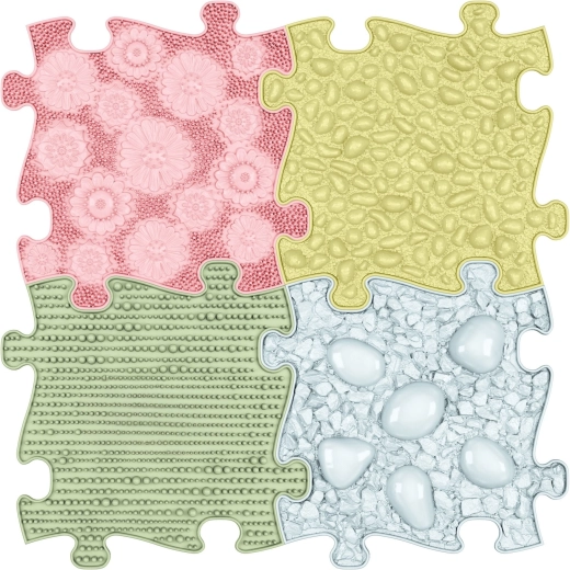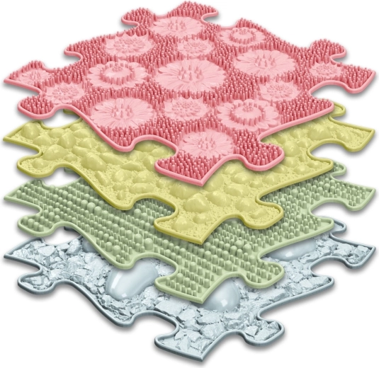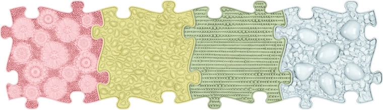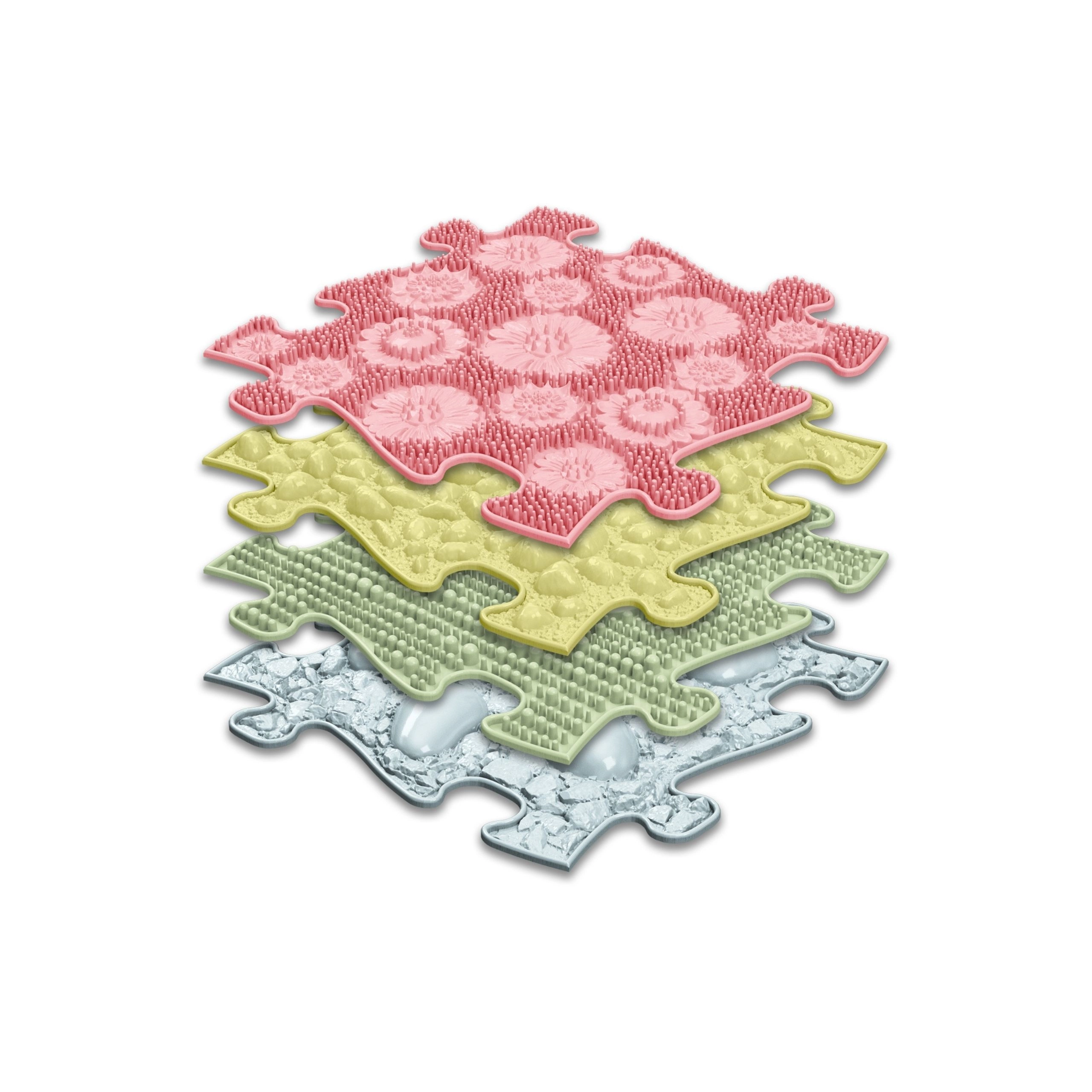 Le set de 4 tapis orthopédiques combine des pièces dures et souples pour une stimulation sensorielle complète. Le système de puzzle interconnectable permet de créer facilement votre propre chemin de marche pour la promenade, le jeu ou les exercices d’équilibre. La surface antidérapante à reliefs (prairie, cailloux, reliefs, œufs de dinosaure) masse en douceur les pieds, soutient le bon développement de l’appareil locomoteur et aide à prévenir les pieds plats.