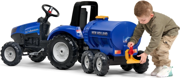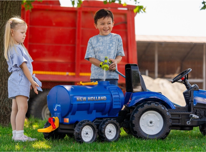 Complétez le tracteur pour enfants avec une remorque-citerne réaliste sous licence NEW HOLLAND. La remorque à deux essieux offre un grand réservoir d’eau, un robinet/asperseur fonctionnel, un couvercle supérieur ouvrant et quatre roues stables pour un jeu sécurisé au jardin. Fabriquée en France en plastique résistant.