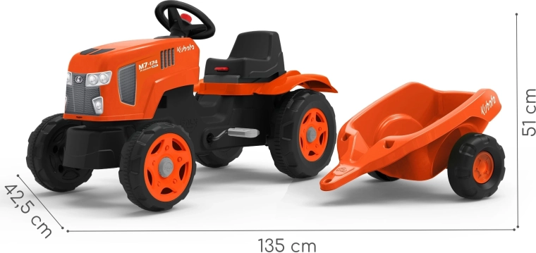 Découvrez le plaisir en plein air avec le tracteur à pédales FALK sous licence officielle Kubota. Ce robuste modèle orange est fabriqué à 75 % en plastique recyclé, dispose d’une sellette réglable sur 3 positions, d’un capot ouvrant et d’une remorque amovible. Idéal pour les enfants de 2 à 6 ans – favorise le mouvement, la coordination et le jeu créatif. Conçu avec exigence de qualité en France.