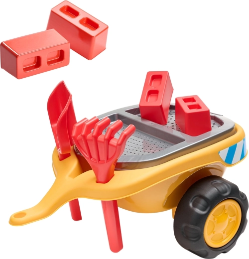 Comprend une remorque pour transporter un tamis, une pelle, un râteau et des « briques ». Favorise le jeu créatif et le développement de la motricité lors du chargement et du déchargement.