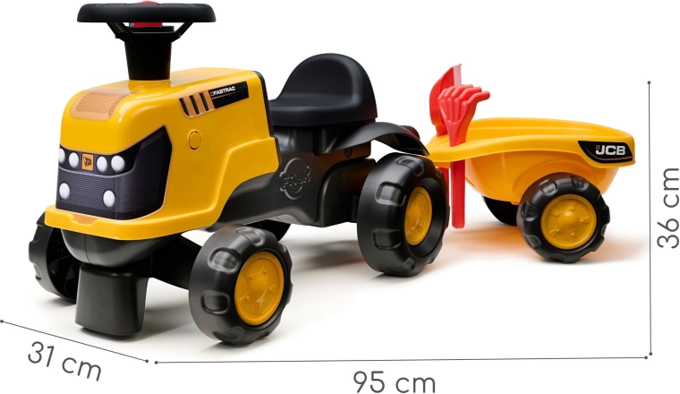 Adorable porteur JCB Fastrac, le premier véhicule idéal pour les enfants dès 12 mois. Fabriqué en France avec au minimum 90 % de plastique recyclé, il offre des roues silencieuses avec couche en élastomère, un guidon avec klaxon et une remorque amovible avec pelle et râteau pour s’amuser à la maison comme au jardin.