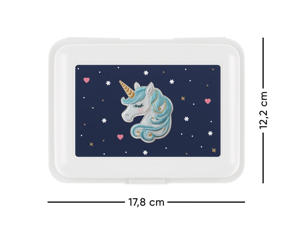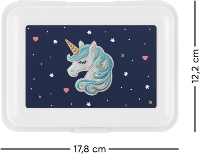 Boîte à goûter élégante de couleur blanche avec le motif Unicorn Gold de la marque Baagl. Elle offre une construction en plastique robuste, une fermeture pratique à un seul loquet et une cloison intérieure pour une meilleure organisation des encas. Idéale pour l’école, les activités et les excursions.