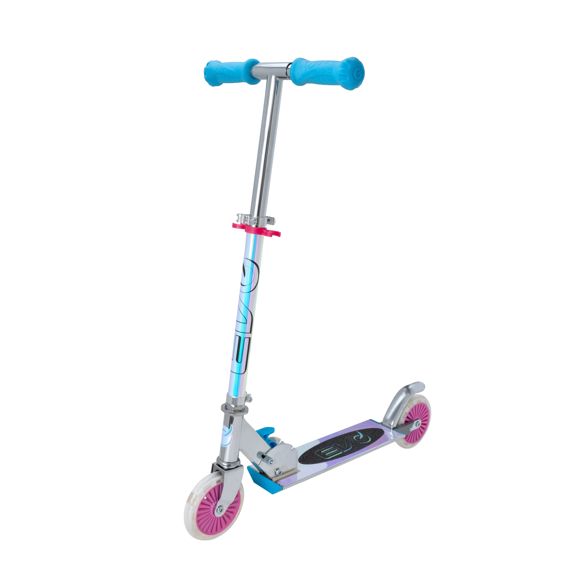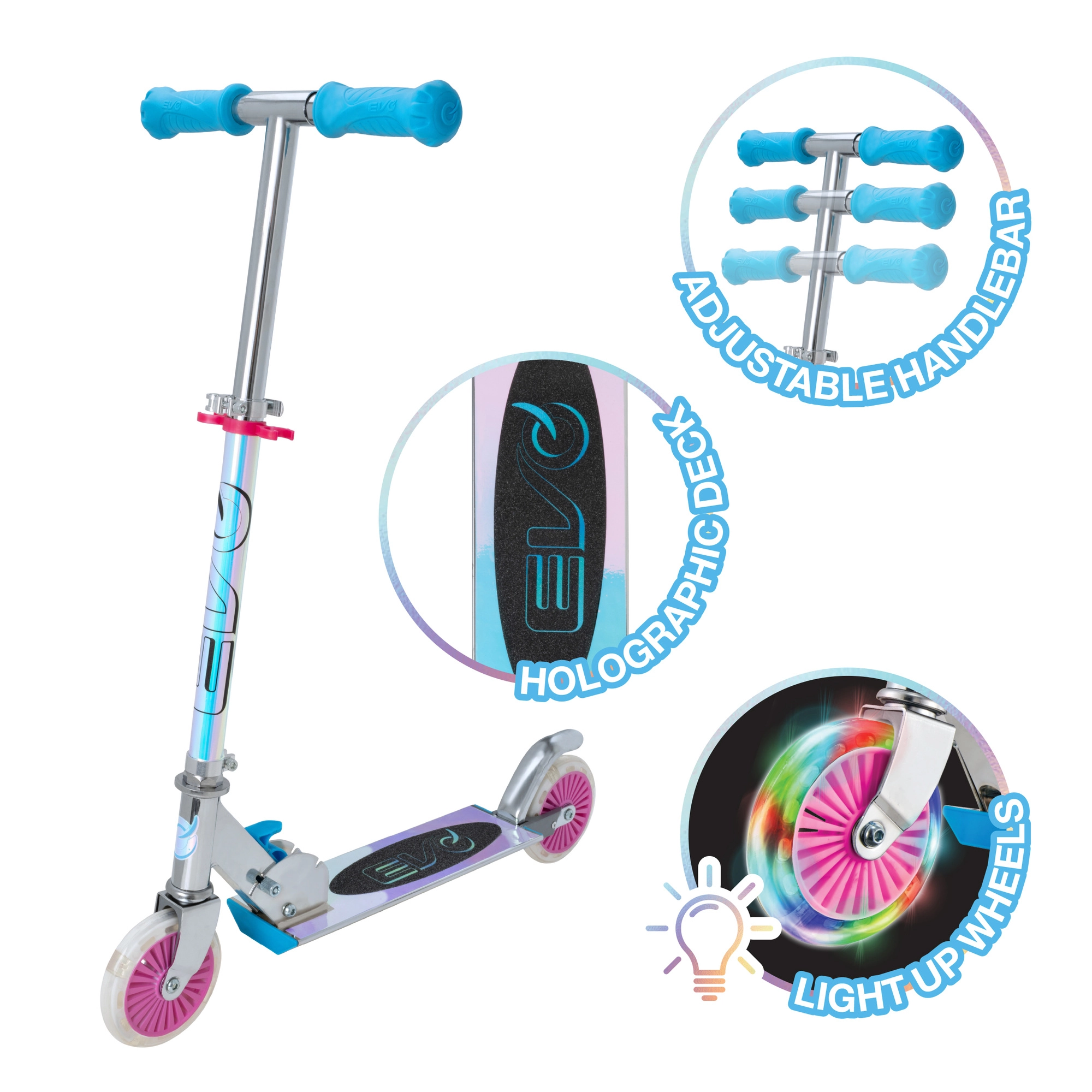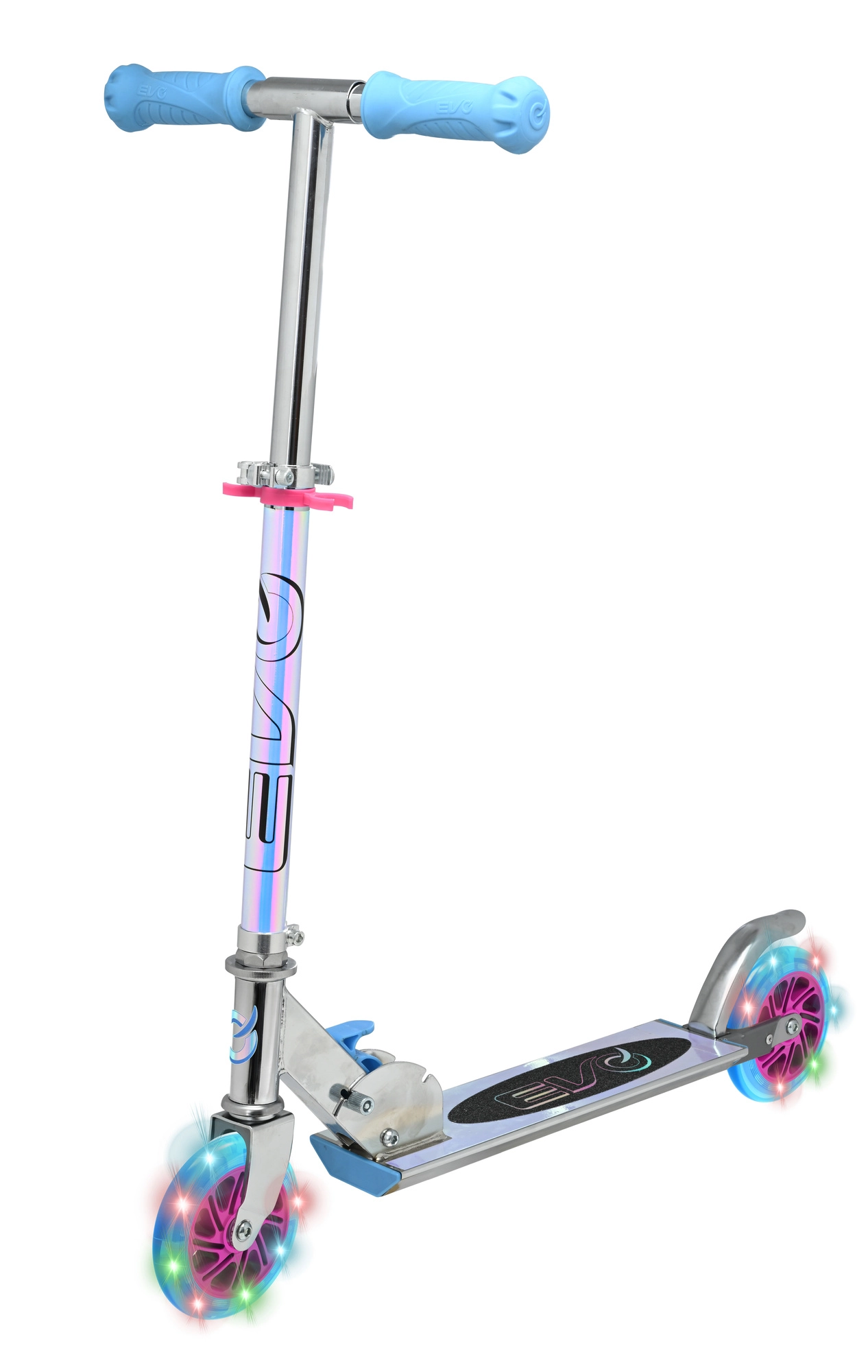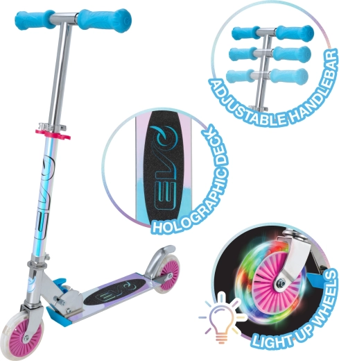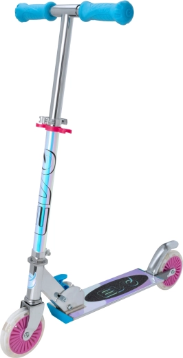Trottinette pour enfants EVO, légère et résistante, avec roues LED lumineuses, cadre pliable et guidon réglable pour enfants dès 5 ans. Offre une glisse fluide grâce aux roulements ABEC-5, un frein arrière à pied pour un arrêt en sécurité et une charge maximale de 50 kg. Un excellent choix pour s’amuser au parc comme sur le trottoir.