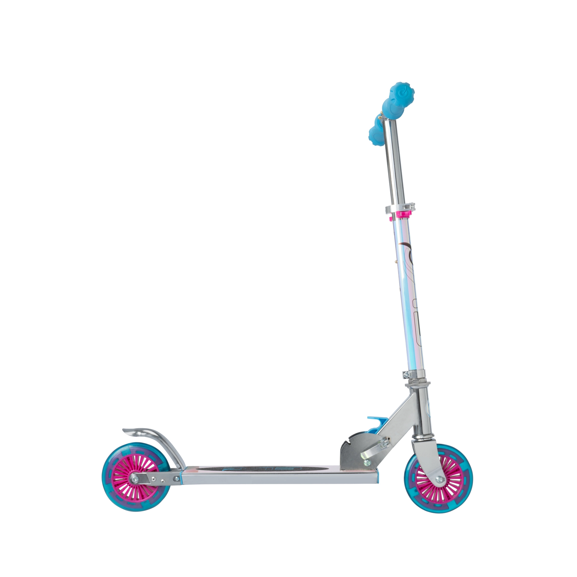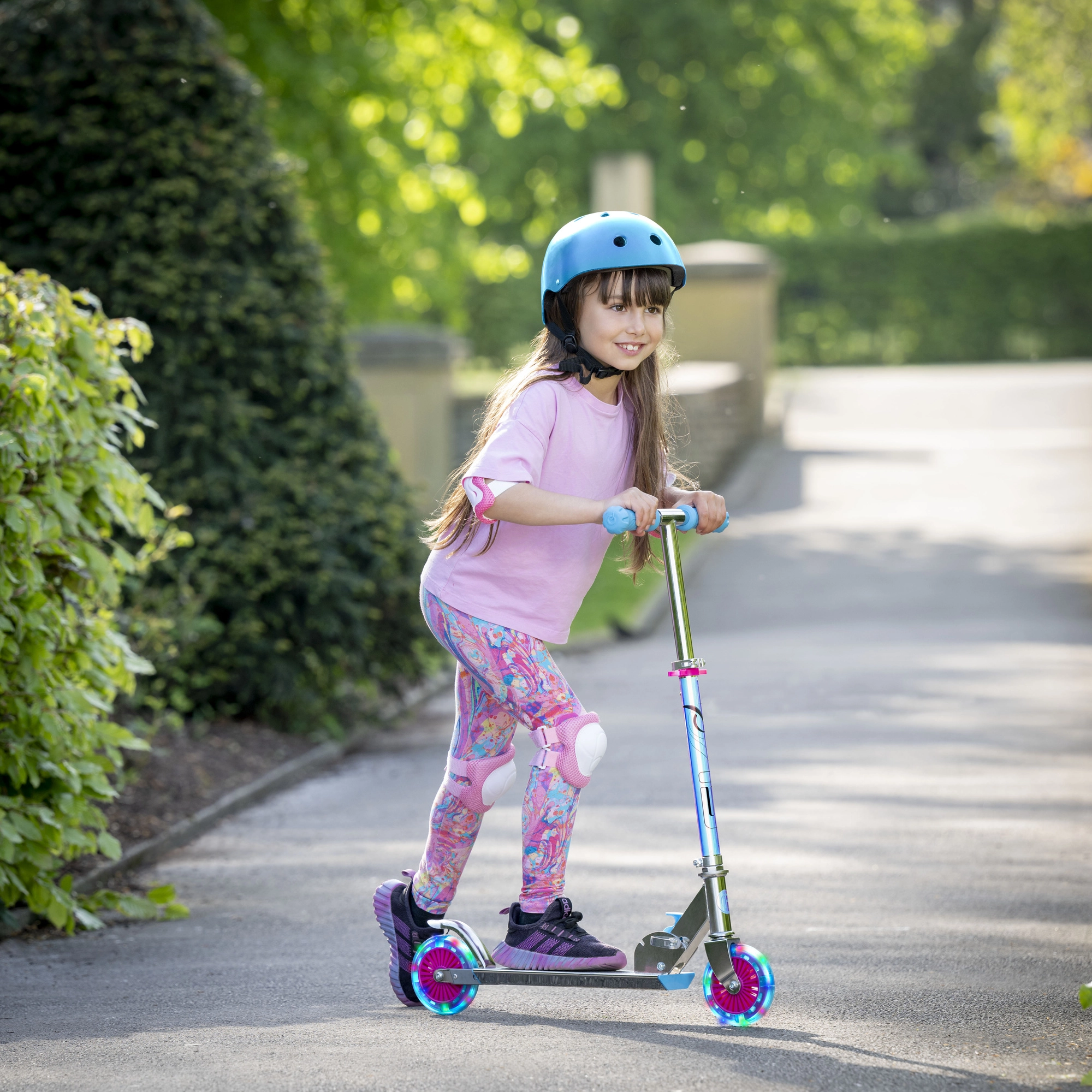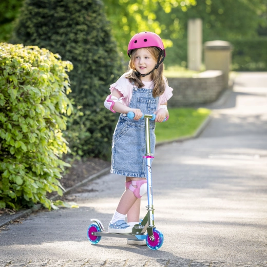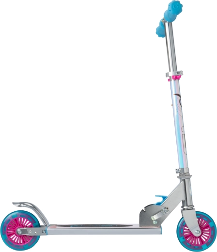 Trottinette pour enfants EVO, légère et résistante, avec roues LED lumineuses, cadre pliable et guidon réglable pour enfants dès 5 ans. Offre une glisse fluide grâce aux roulements ABEC-5, un frein arrière à pied pour un arrêt en sécurité et une charge maximale de 50 kg. Un excellent choix pour s’amuser au parc comme sur le trottoir.