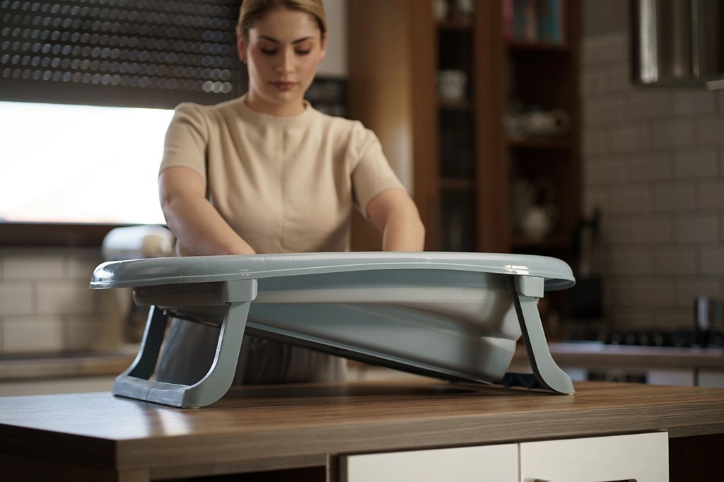 La baignoire se replie en quelques secondes pour atteindre une hauteur d’environ 10 cm. Idéale pour les petites salles de bain, les voyages et un rangement discret après le bain.